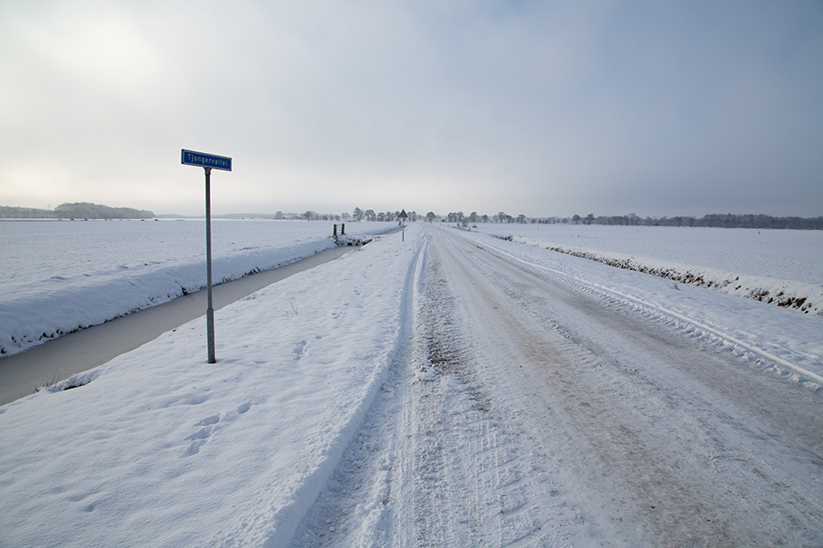 Ik reed verder en wilde via de Tjongervallei richting Oldeberkoop gaan. Eenmaal op de kruising leek het me echter verstandiger om deze besneeuwde weg langs het water te vermijden. Ik koos daarom voor een weg die nagenoeg sneeuwvrij was.