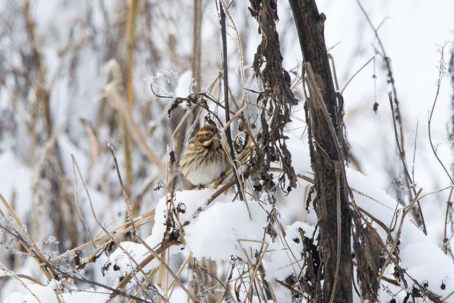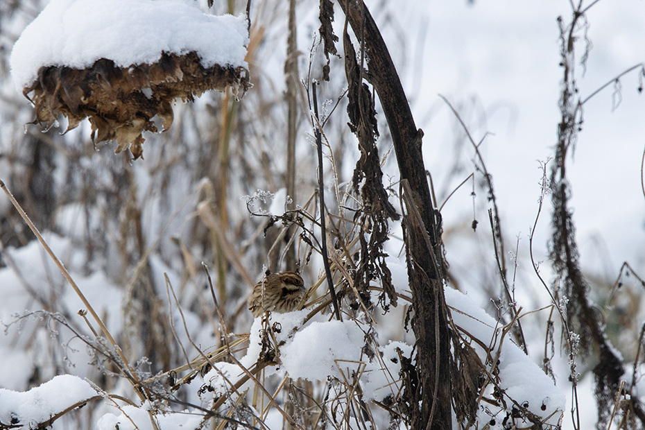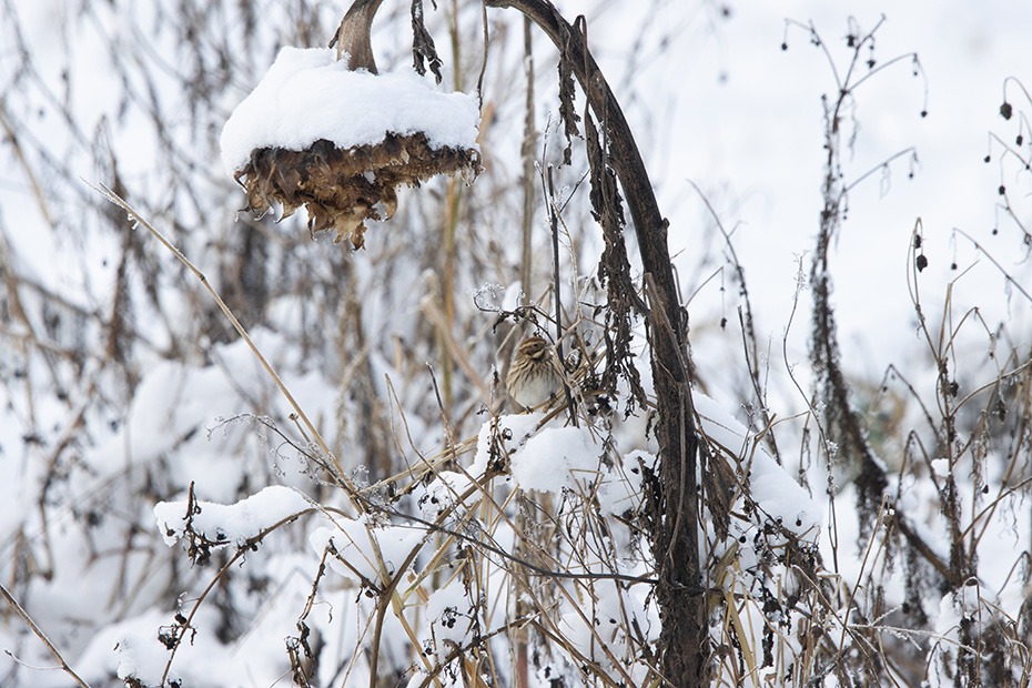 Bij een akker met uitgebloeide zonnebloemen zag ik een vogeltje voorbij vliegen. Voor zover ik het op afstand kon beoordelen, leek het mij geen alledaagse verschijning. Met de telelens maakte ik enkele foto’s. Later, thuis achter de computer en met behulp van Obsidentify, ontdekte ik dat het om een rietgors ging, een vrouwtje.
