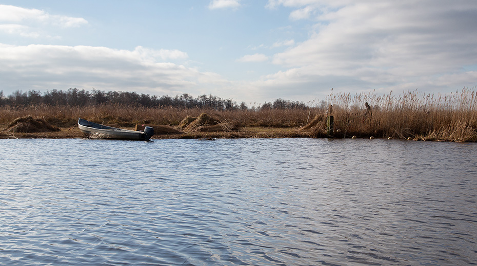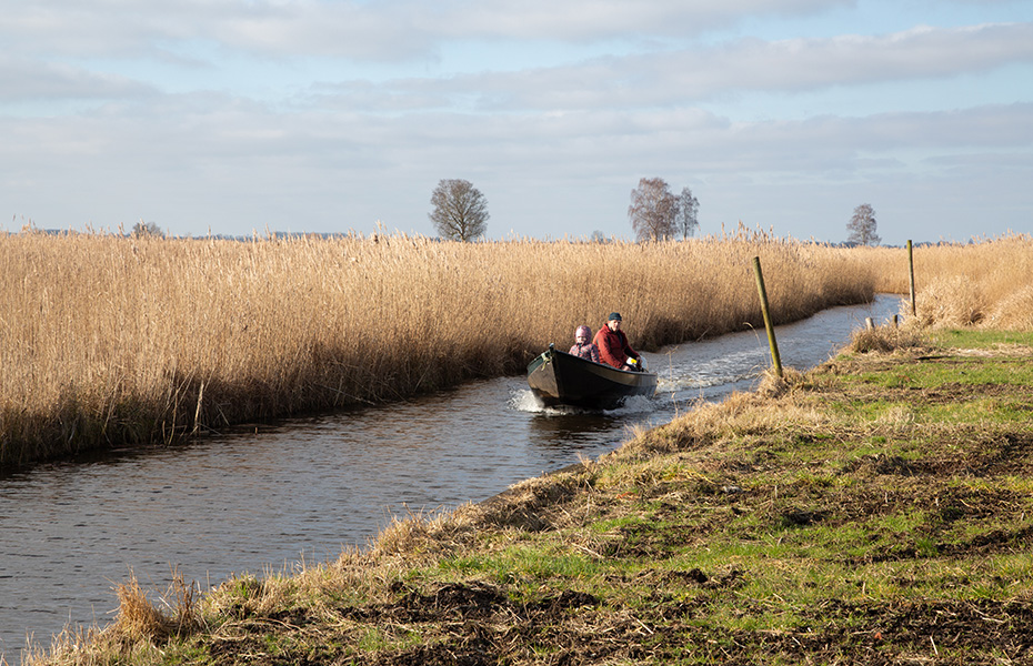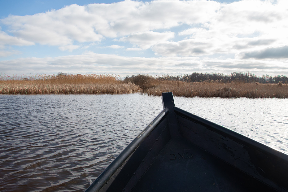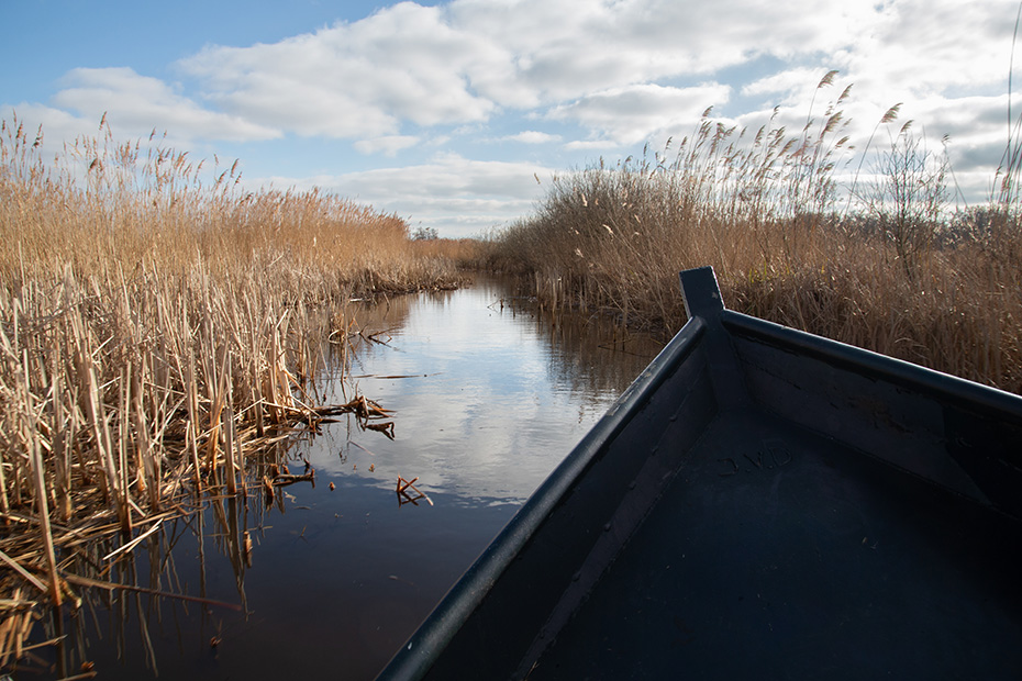 Het volgende moment doken we een smal slootje in, waar een buitenstaander niet zou vermoeden dat je er überhaupt met een boot kunt varen. Tussen het riet slingerden we verder, tot we aankwamen bij het rietland van Jan, die we hier voor het gemak maar even Jan S. noemen. 😉