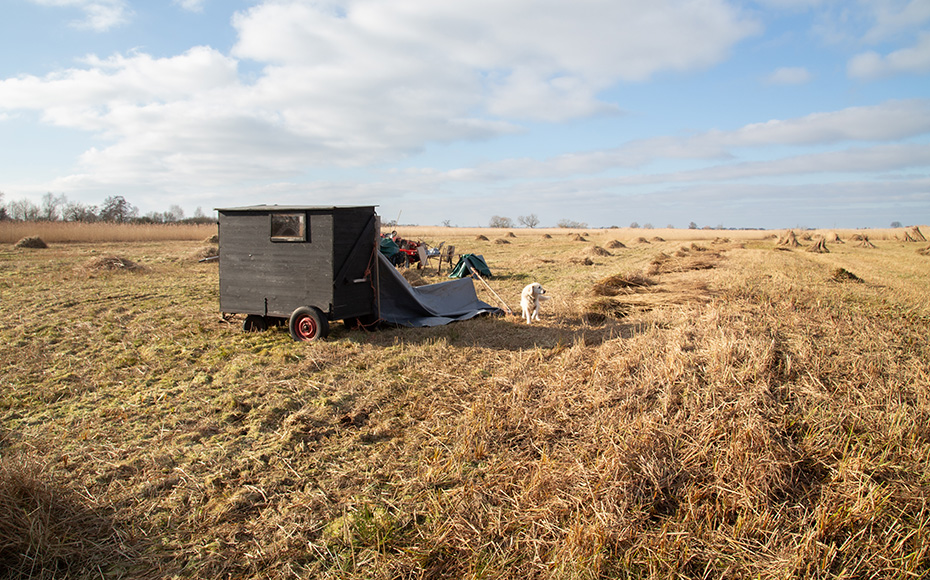 Het eerste wat me opviel toen ik bij het rietland kwam, was de kleine maar verrassend praktische schaftkeet. Je kunt er niet rechtop in staan, maar met twee personen zit je er prima beschut. Verder stond er een indrukwekkende verzameling machines en hulpmiddelen klaar. Alles wat hier gebruikt wordt, moet per boot worden aangevoerd.