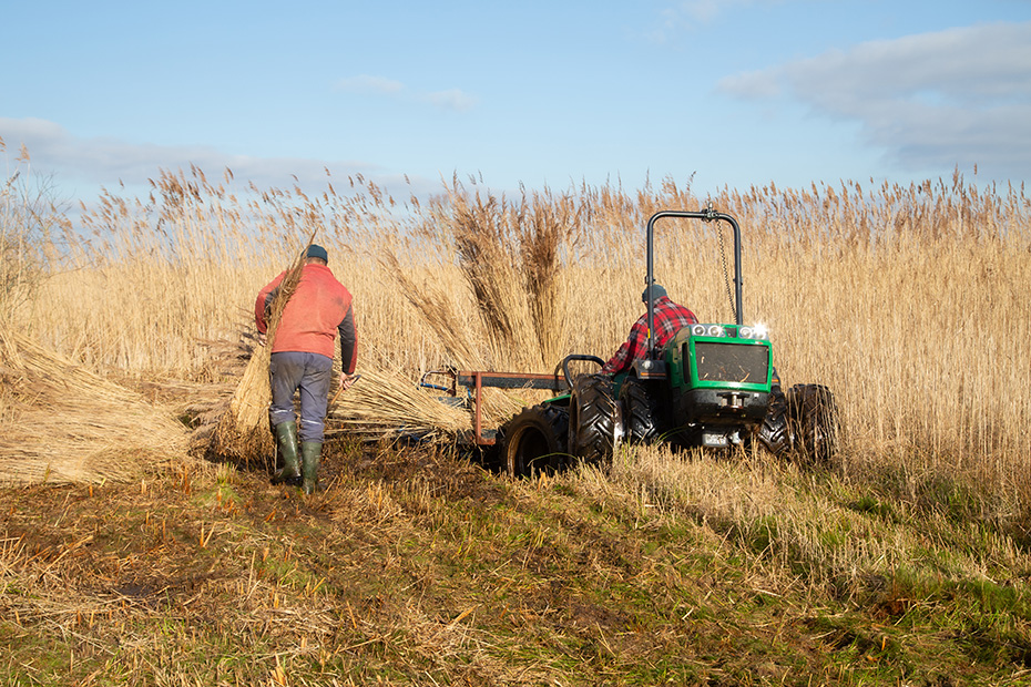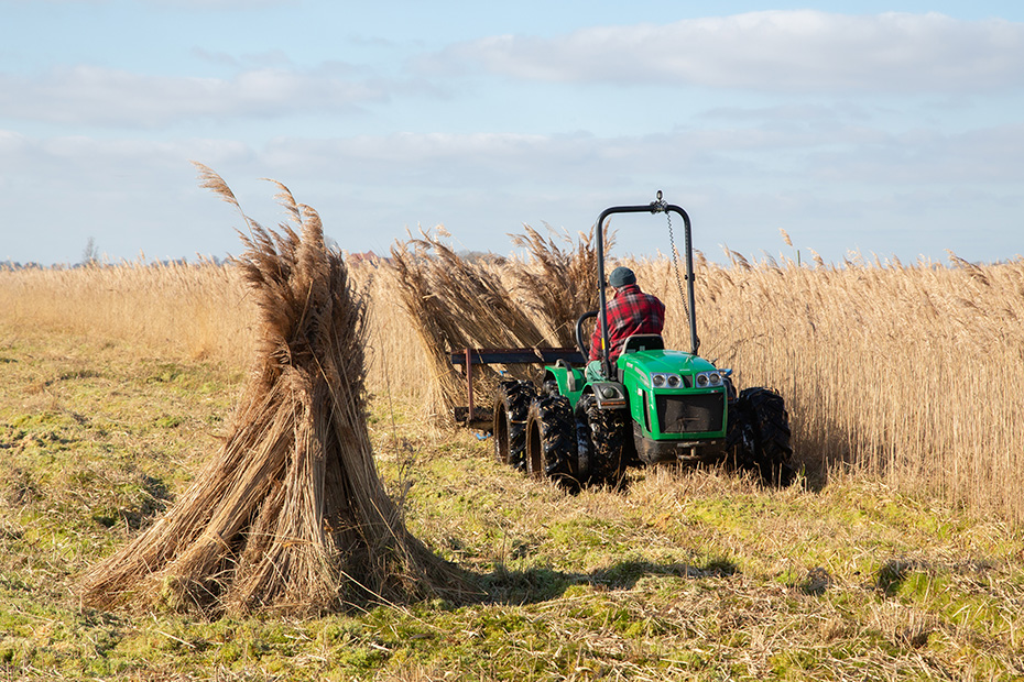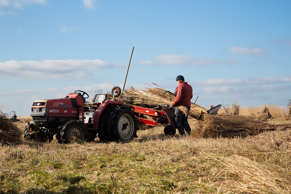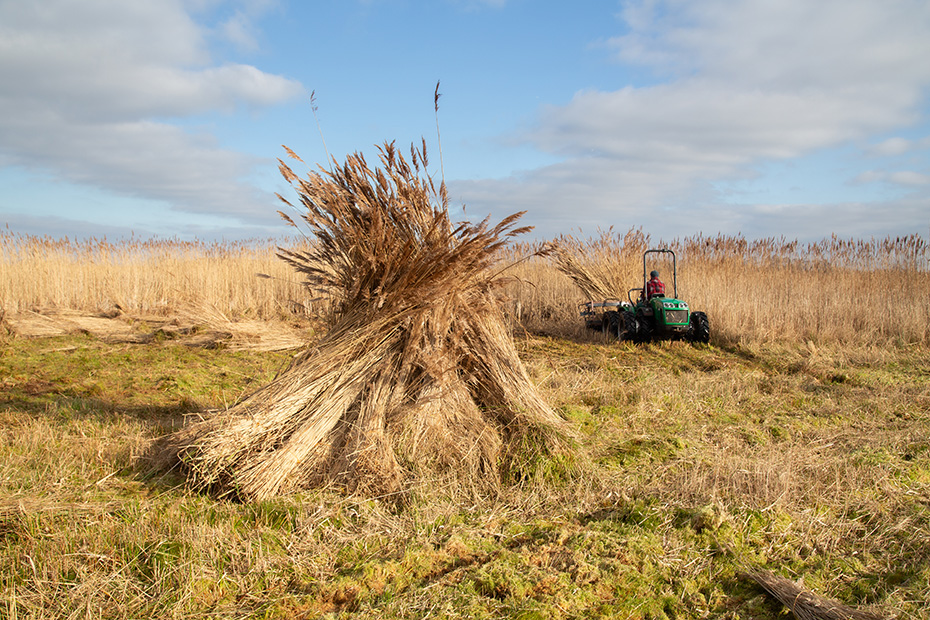 De machine waarmee hij werkt is een zogenaamde zelfbinder: elk klein bosje riet wordt automatisch samengebonden met een touw en vervolgens opzij getransporteerd, waar het op de grond terechtkomt. Klaas Jan verzamelt de gebonden bosjes en zet ze tegen een schoof om te drogen.
