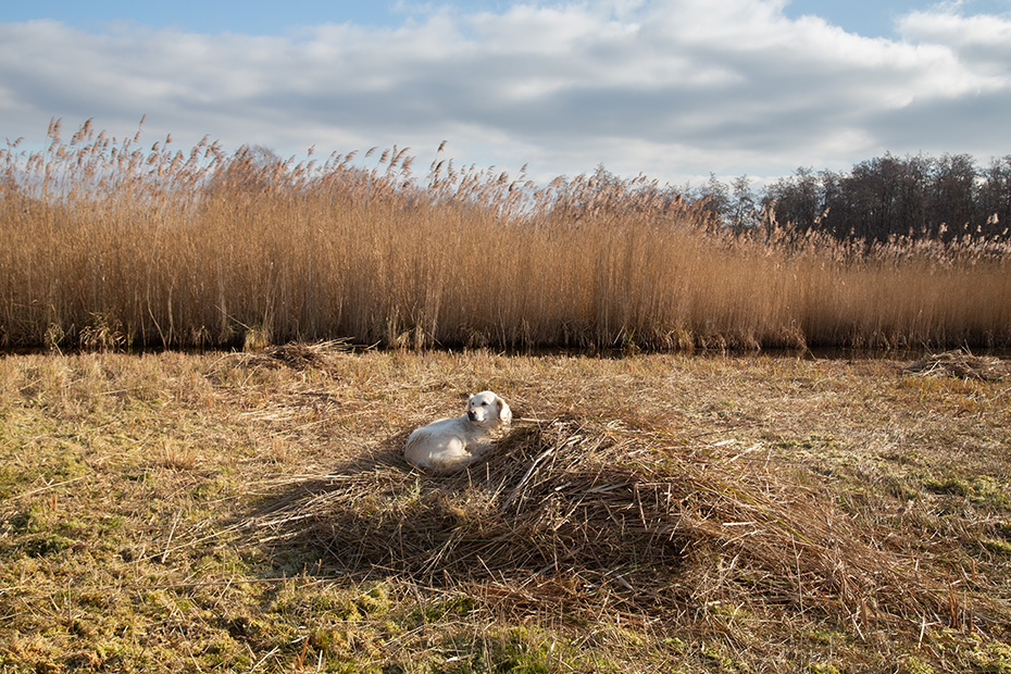 Vandaag neem ik jullie weer mee naar het rietland van mijn tantezegger, Klaas Jan. Het was al tegen lunchtijd toen Jan en ik daar arriveerden. Het was er een gezellige drukte. Het gezin van Klaas Jan was aanwezig, maar ook andere familieleden van Klaas Jan. Deze keer was er een warme lunch, bestaande uit hamburgers. En die gingen er prima in. Trouwe viervoeter Rhena zat ondertussen verwachtingsvol klaar om ook een hapje mee te pakken.