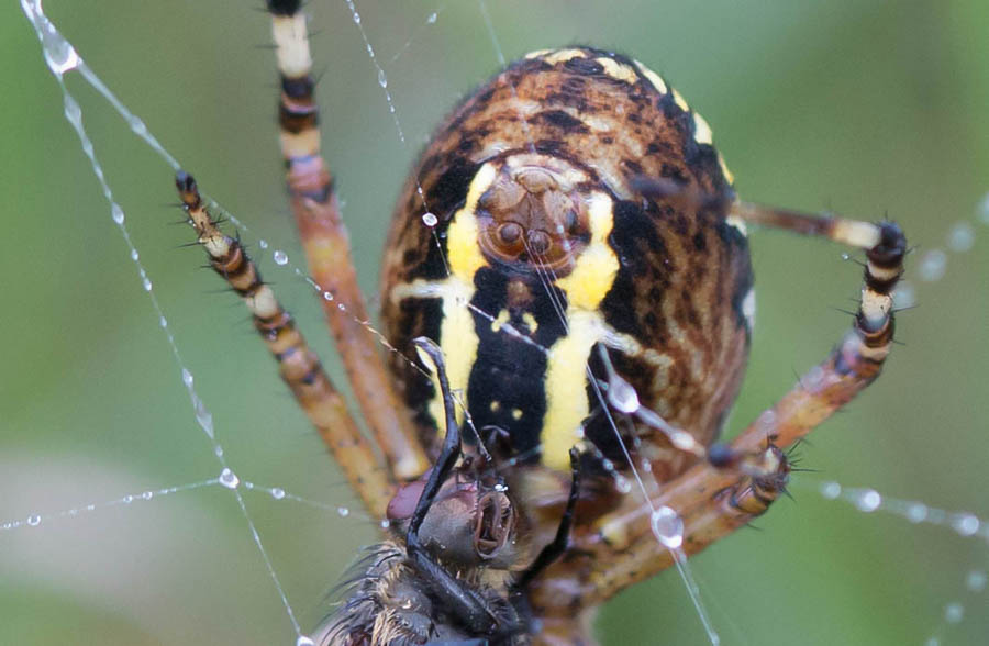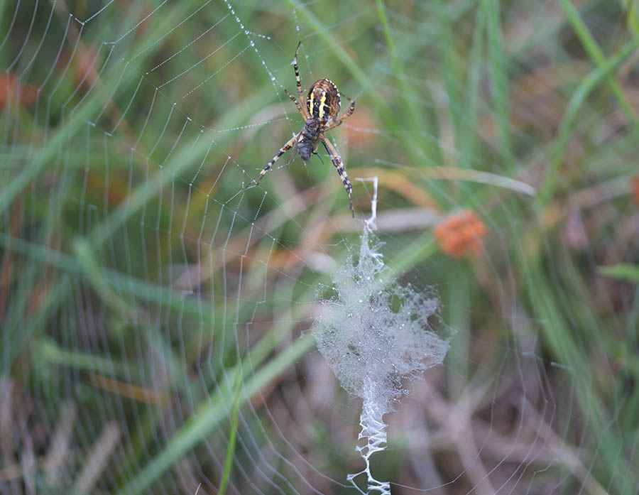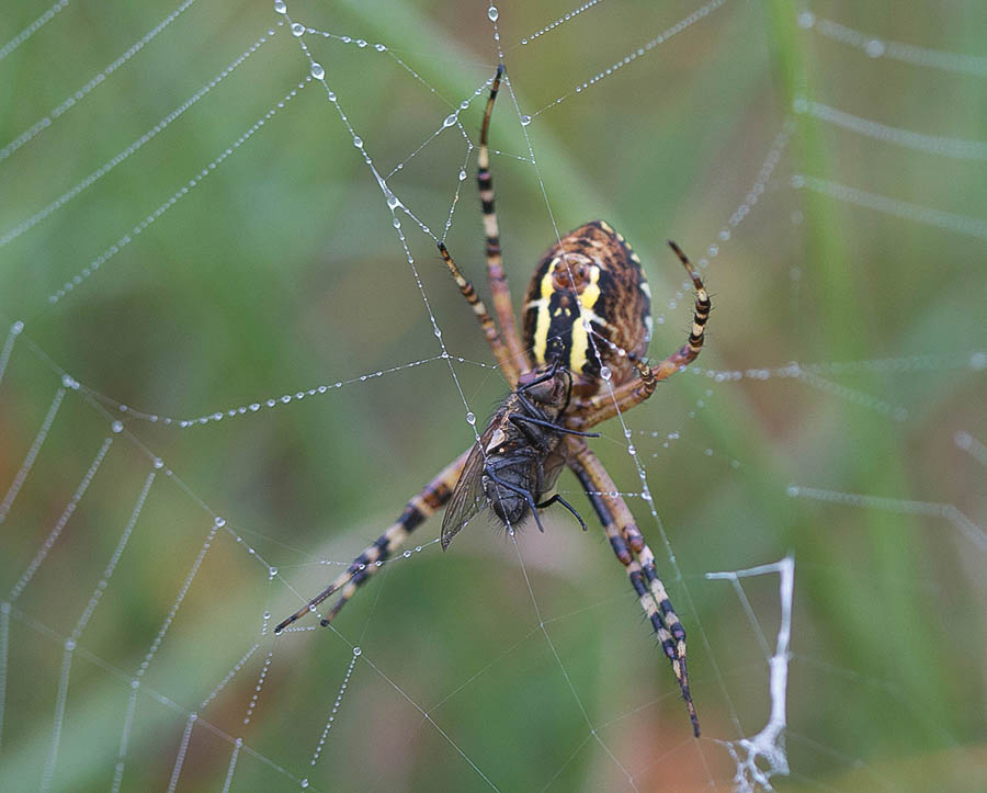Tijdens de fotokuier in de vroege ochtend op de grote stille heide legde ik een wespspin met prooi vast. Op deze site kun je alles lezen over het gedrag van deze interessante spin. Klik op de foto voor groot formaat.