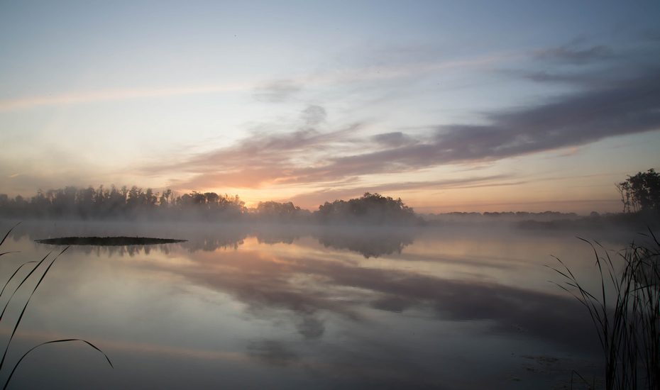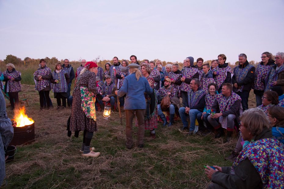 Na het welkom met koffie en het verhaal van Marjan Berk verlieten we het KGH door de achterdeur en stonden we gelijk tussen de rietvelden. Bij de achterdeur ontvingen we allemaal een cape in de jaren 60-stijl. Daarnaast kregen we allemaal een vleugje anti-muggenspray op de hand gespoten. Dat laatste was meer voor de show dan dat het de muggen bij ons vandaan hield.