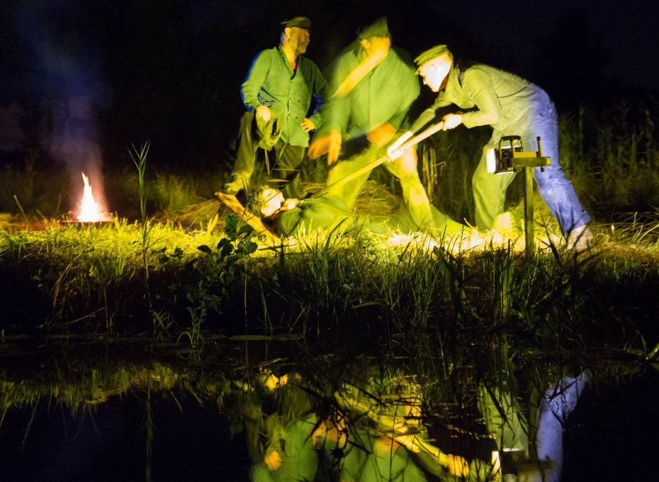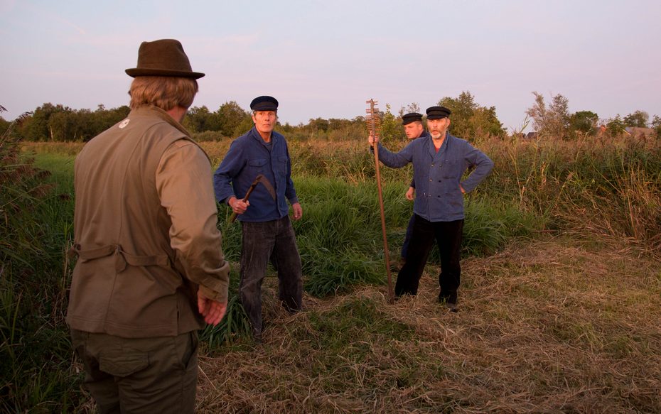 In de volgende scène hebben drie rietsnijders het aan de stok met de man van Staatsbosbeheer. Het verschil in belangen en de bijbehorende onenigheid is dus van alle tijden. De rietsnijders sommeerden met krachtige termen dat de man hun rietland moest verlaten.