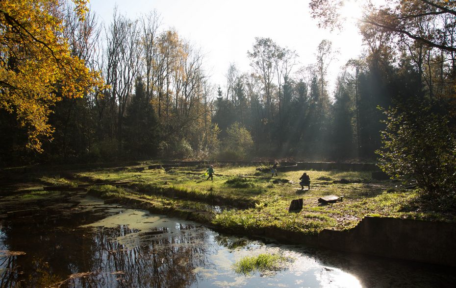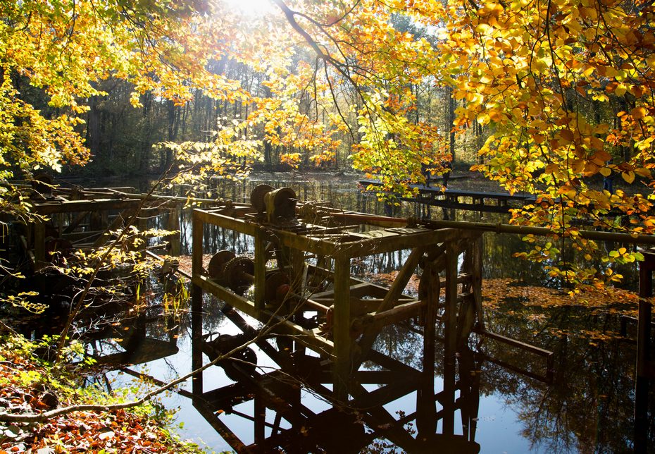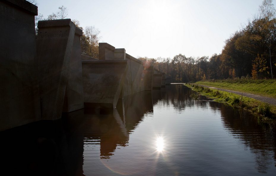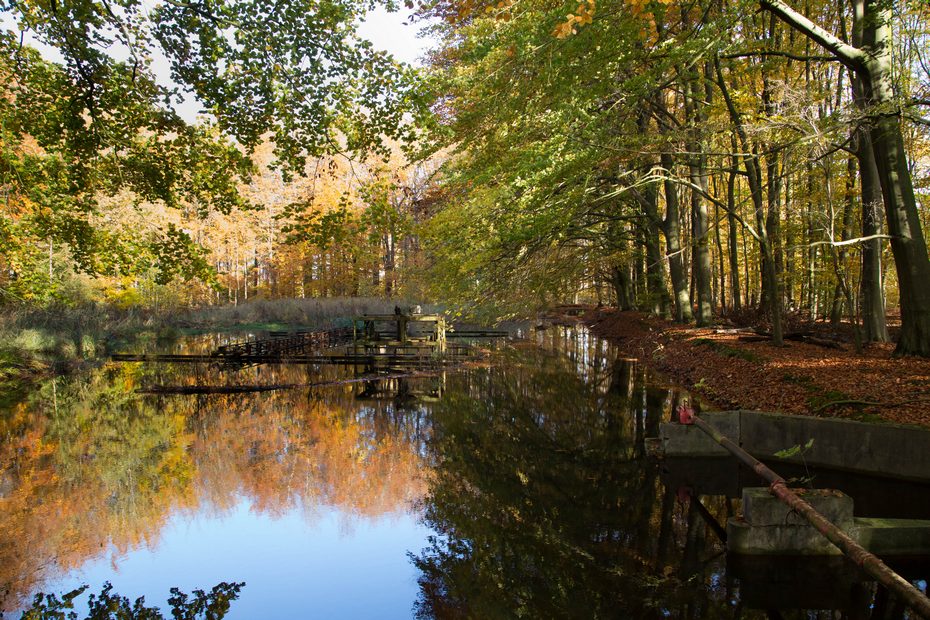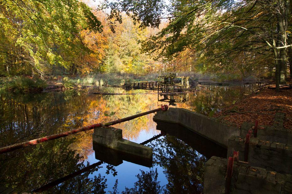 Oude watergoten, stuwen en sluizen zijn begroeid met struiken en planten. Sterrenmos bedekt oevers, varens omringen de contouren van oude havens en in het water groeien zilvergrijze wilgen.