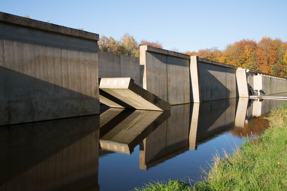 Het Waterloopkundig Laboratorium deed jarenlang onderzoek in het Waterloopbos en bootste met water, stuwen, dammen en golfslagmachines de werkelijkheid na.