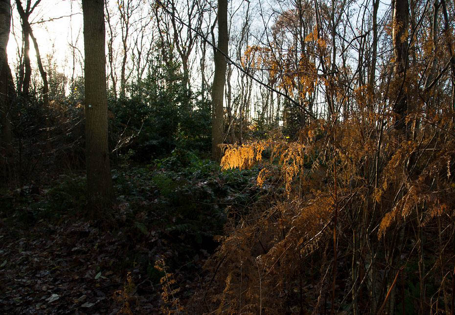 De fotoserie over de varens maakte ik op zaterdag 30 november. Het had die nacht gevroren en het gras was nog wit door de nachtvorst. Ik besloot een fotoronde te maken in de omgeving. Na de rit over diverse landweggetjes en na meerdere fotostops kwam ik terecht op de Paasloër Allee. Ik dacht dat ik inmiddels alle weggetjes in de Kop van Overijssel wel kende, maar op dit weggetje was ik nog nooit geweest. Ik reed langs een klein bos toen mijn blik werd getrokken door een fraai lichtspel. Ik parkeerde mijn auto en stak de droge sloot over en begon te fotograferen. Zie Google Maps voor de locatie. Door in te zoomen en door gebruik te maken van het zonlicht ontstond de fotoserie over de varens. Onderstaande foto geeft een indruk van de plek waar ik de detailfoto’s maakte. Deze foto vind ik fotografisch een stuk minder dan de detailfoto’s van de varens.