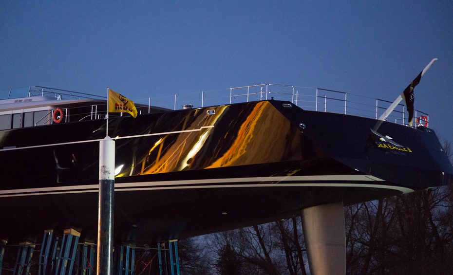 Na de passage van de Kadoelerbrug lag de volgende uitdaging bij de Ramspolbrug. Vanwege het drukke verkeer en de tijdelijke stremming zou dat sowieso in de nacht moeten plaatsvinden. Nadat die passage was volbracht zou de rest van de nacht het geheel blijven liggen in Schokkerhaven De volgende dag zouden ze verder varen en wel over het IJsselmeer en het Markermeer naar Amsterdam. In dit filmpje, gemaakt met een drone zie je het transport over één van de grote meren. De één na laatste uitdaging zou liggen bij Schellingwoude. Het slotstuk was de tewaterlating in Amsterdam. Dat had ik wel graag willen meemaken, maar dat zat er niet in. In dit artikel is te lezen dat het jacht veilig in Amsterdam is aangekomen en dat het inmiddels in het water ligt. Ik heb helaas geen filmpje kunnen vinden van de tewaterlating van Sea Eagle II.