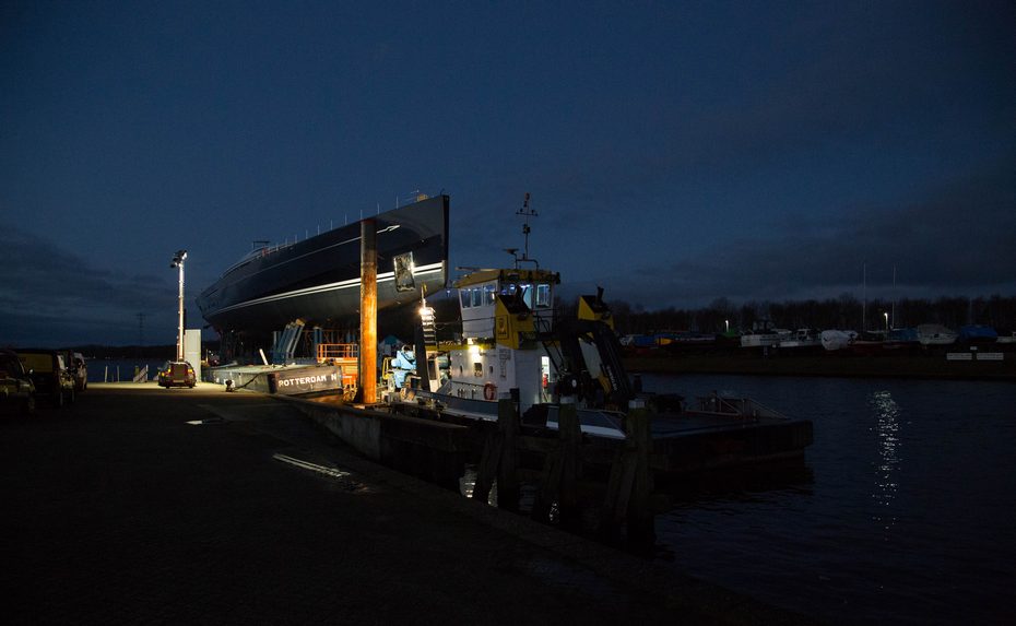 Ik wilde met eigen ogen zien hoe het grootste aluminium zeiljacht ter wereld eruitziet. Op dinsdag 7 januari verliet het schip per ponton de hangar van Royal Huisman Shipyards. Zie de site van De Stentor.  De dagen erna werd het geheel klaargemaakt voor de reis naar Amsterdam. Die reis begint vanmiddag rond 14 uur.