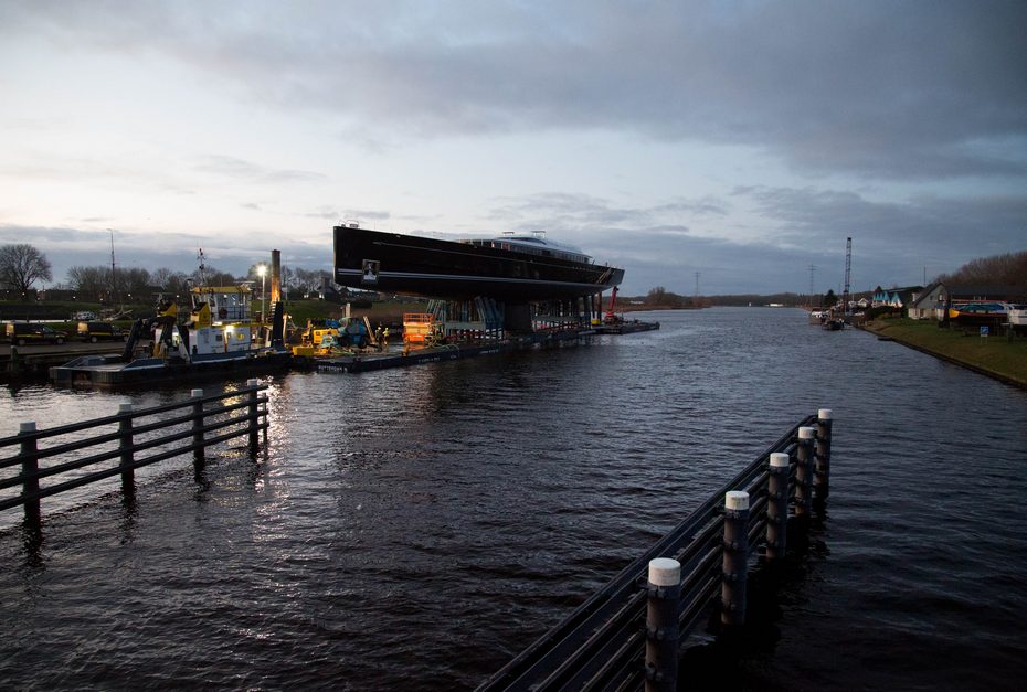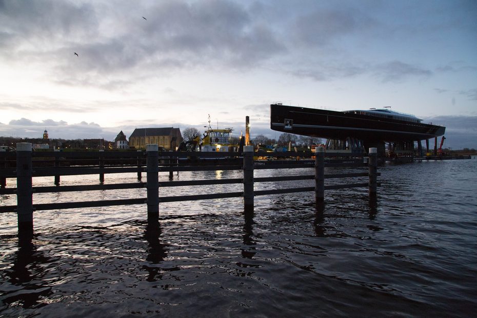 Vanwege teveel wind werd het vertrek van het jacht een dag uitgesteld. Dat was voor de inwoners van Vollenhove en toevallige voorbijgangers een geluk. Tientallen mensen namen een kijkje en maakten een foto van dit in het oog springend object.