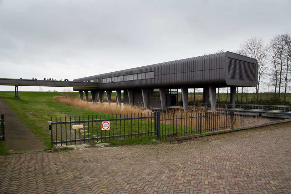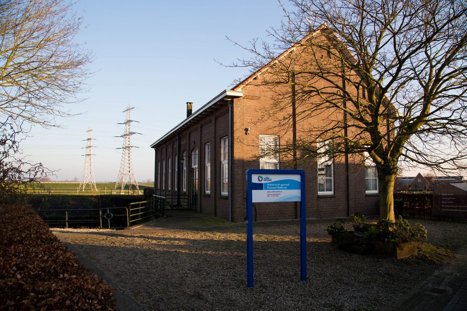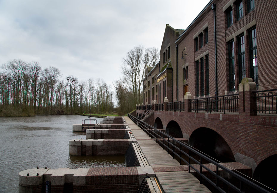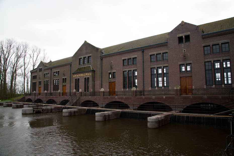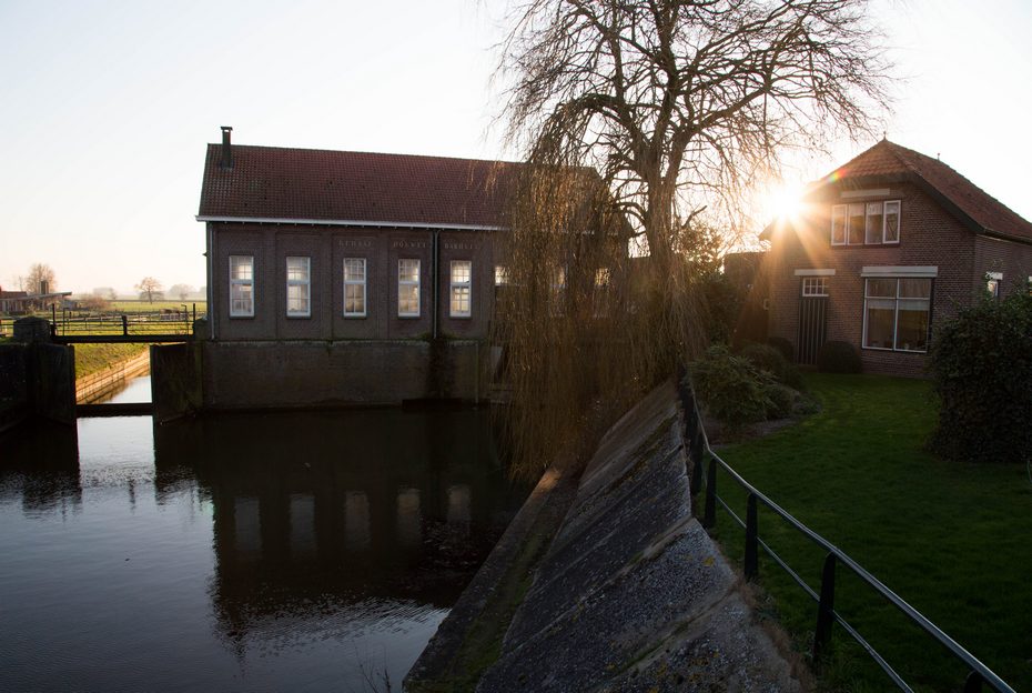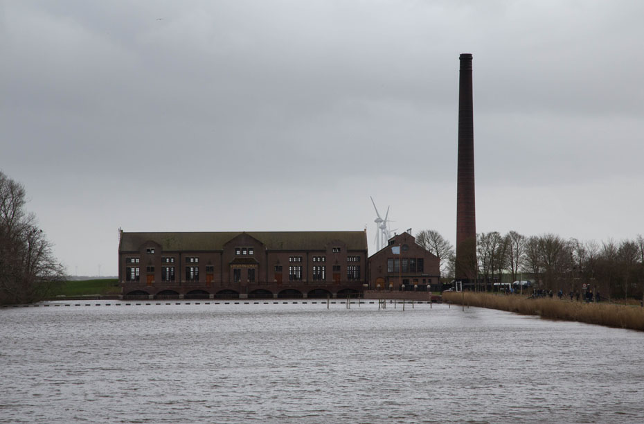 Vanaf daar staken we de weg over en namen het pad naar het Tjeukemeer. Tussen de bomen door doemde het gemaal van Echten op.