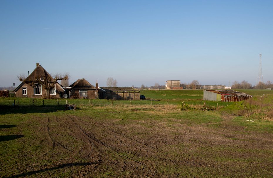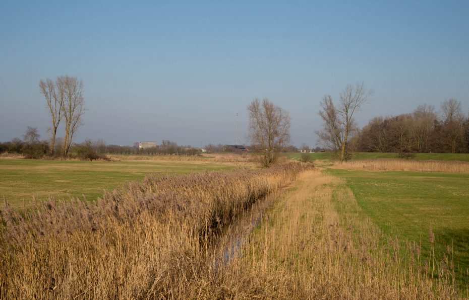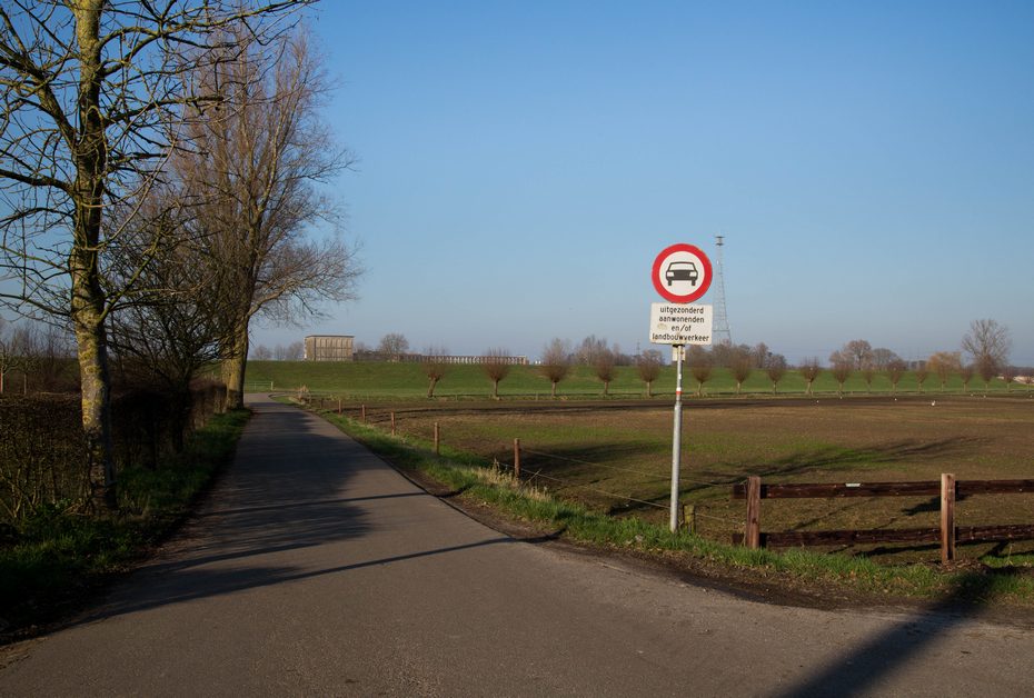 Na de wandeling en de fotosessie op de oever van de IJssel ben ik via een ander weiland weer teruggelopen richting de dijk. Na de oversteek van het weiland kwam ik via een pad en een weggetje uit op de Fabrieksweg, de weg die over de dijk loopt. Aan de horizon staat het restant van de IJsselcentrale. Daar kom ik verderop in het verhaal op terug.
