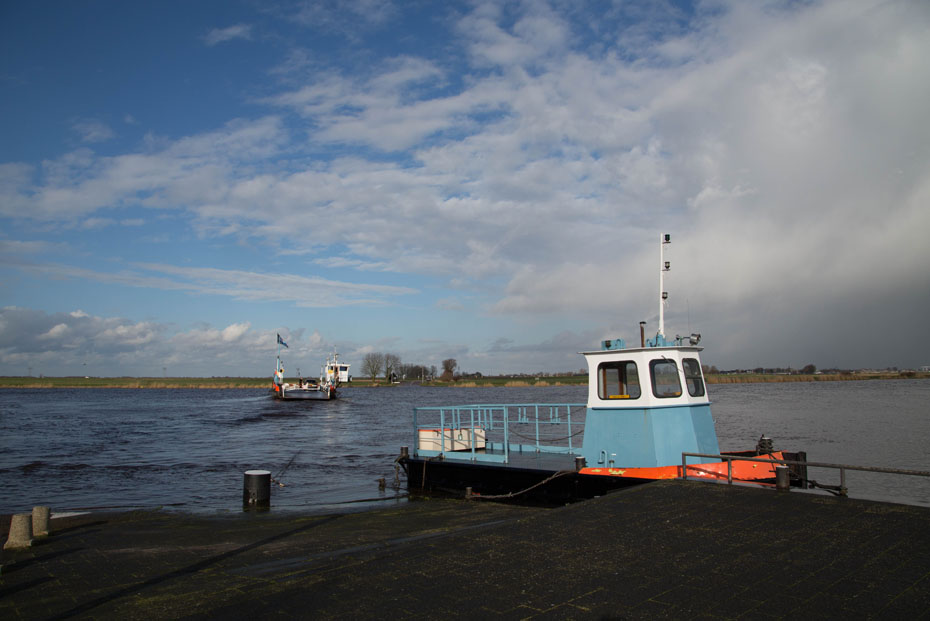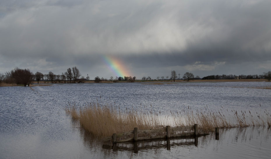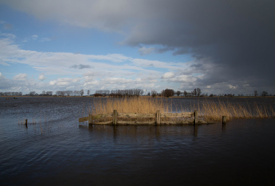 Mijn zus en ik vervolgden onze rit over de dijk langs het Zwarte Water. We maakten een stop bij een volgend fotogeniek plekje. Een houten hek in een decor van riet stond in het hoge water. De dreigende lucht erboven maakte het plaatje compleet.