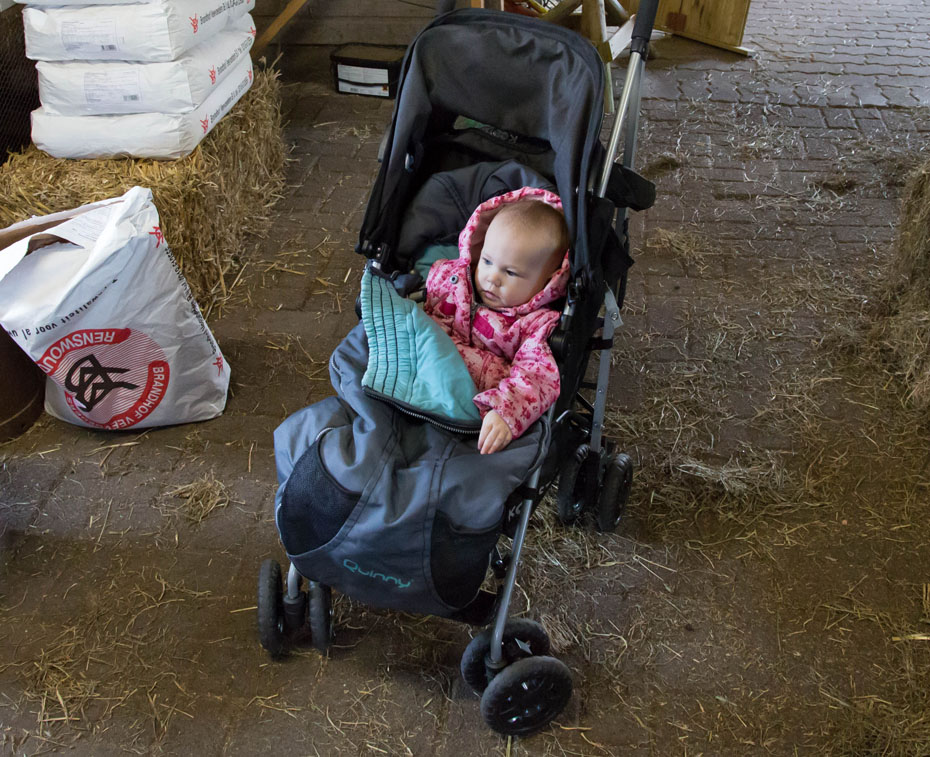 Tijdens het voeden van de lammetjes keek de jongste telg van het gezin vanuit de buggy toe.