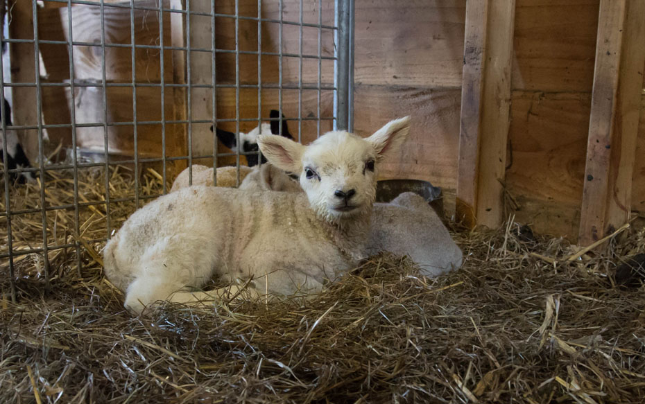 Twee lammetjes die de de avond daarvoor waren geboren moesten in de gaten worden gehouden of ze wel goed dronken bij hun moeder. Zonodig werden ze een handje geholpen.
