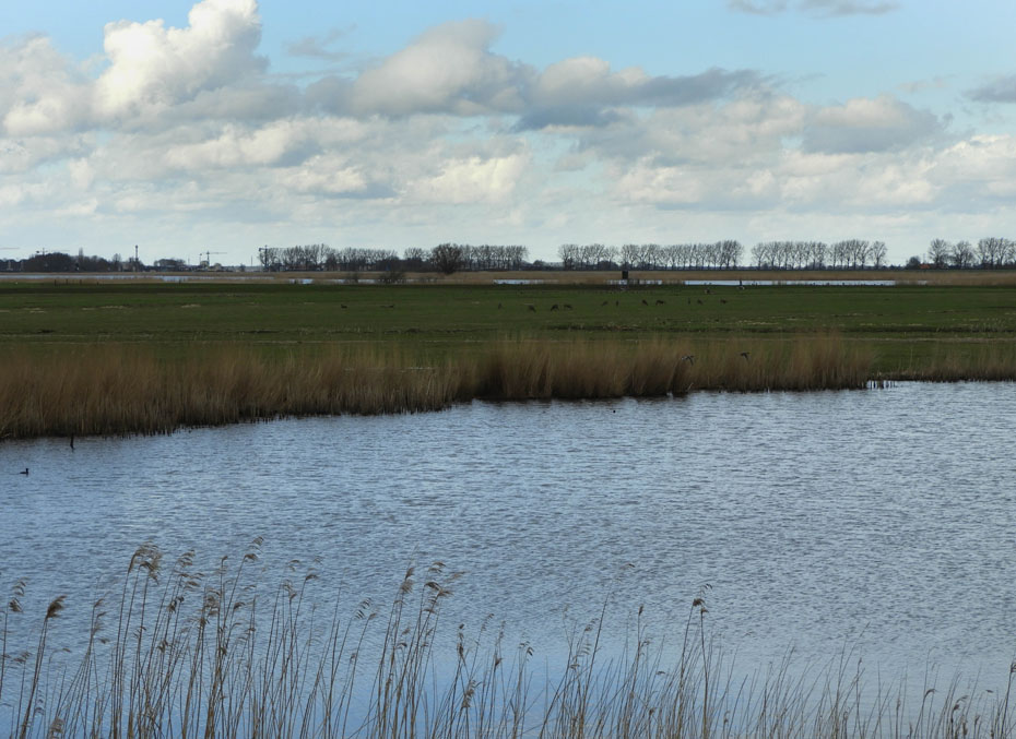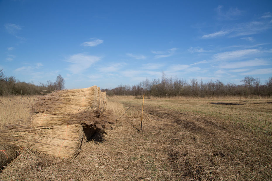 Vanaf de plaats waar Sander aan het werk was vervolgde ik mijn weg richting Klaas Jan. Tussendoor genoot ik van het uitzicht. Deze rietstengel stond te ver uit de oever en was ontsnapt aan de rietsnijders.