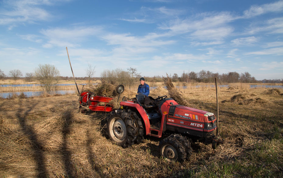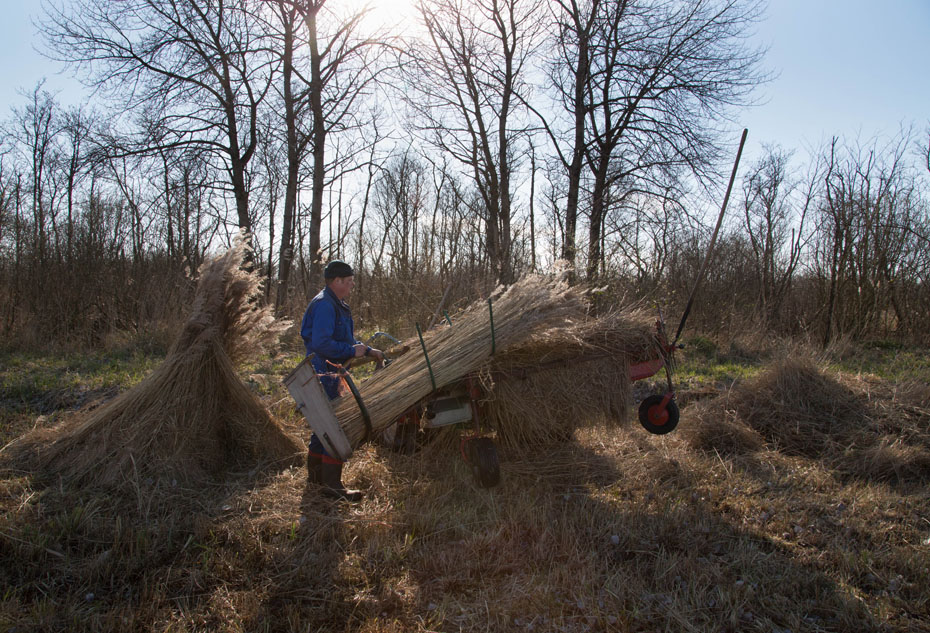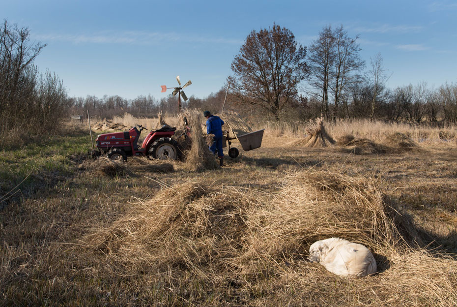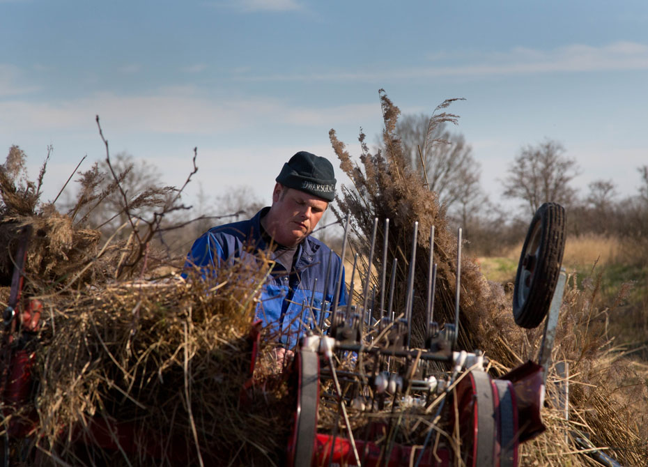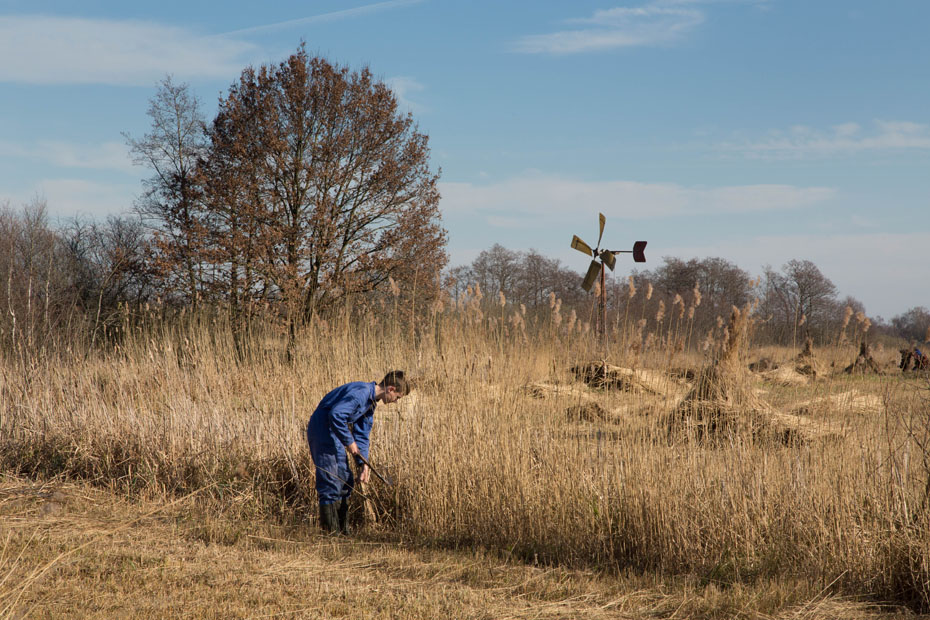 In de buurt van de keet was Sander bezig met het snijden van het riet met behulp van een snit.