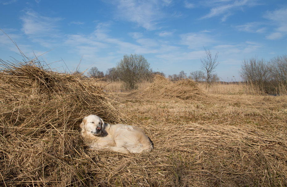 Terwijl ik op grote afstand een paar woorden wisselde met Klaas Jan zag Rhena dat het goed was. Ze legde zich te ruste in een hoop ruigte. Ruigte is afval wat uit het riet is gekamd.
