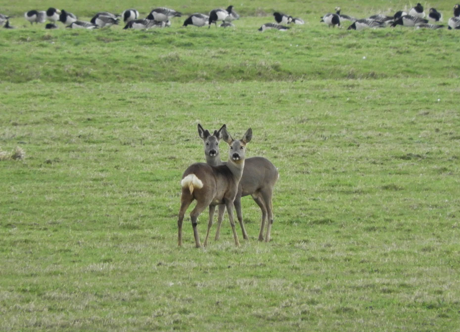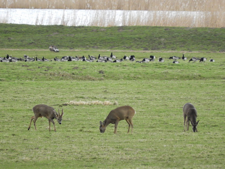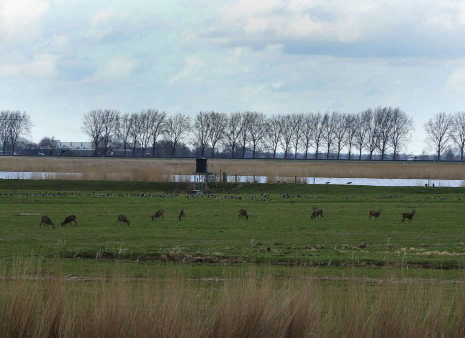 Terwijl mijn zus en ik over de dijk langs het Zwarte Water van Hasselt naar Genemuiden reden zag ik in het weiland een grote groep reeën staan. Op mijn verzoek parkeerde mijn zus de auto.
