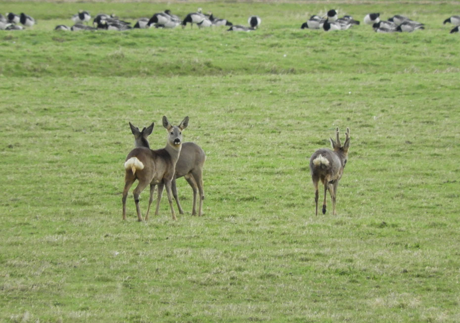 Met de Nikon bridgecamera zoomde ik in op drie reeën. Wij stonden in de straffe wind bovenwinds. Terwijl wij foto’s maakten gingen de reeën rustig door met grazen.