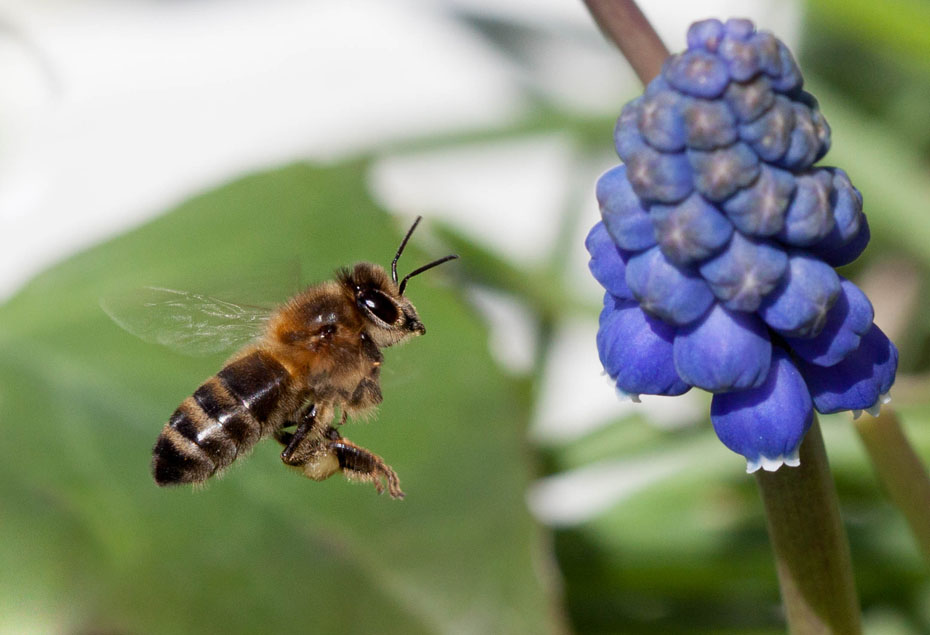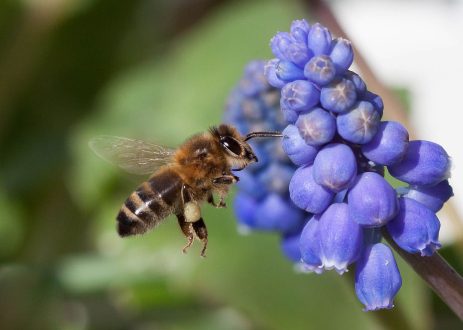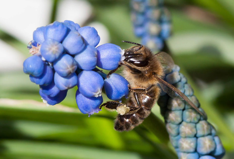 In onze tuin hebben we naast het terras een verhoogde border. In deze tijd van het jaar bloeien daar de blauwe druifjes. Terwijl ik daar heerlijk in het zonnetje lekker zat ‘af te schalen’ (in ziekenhuis zijn we aan het opschalen) zag ik dat de blauwe druifjes druk werden bezocht door de bijen. Ik haalde mijn camera met het macro-objectief op en ging er eens lekker voor zitten. Een bij streek neer op, de door de zon verwarmde, muurtje. Op de computer zag ik dat het arme beestje onder de mijten zat.