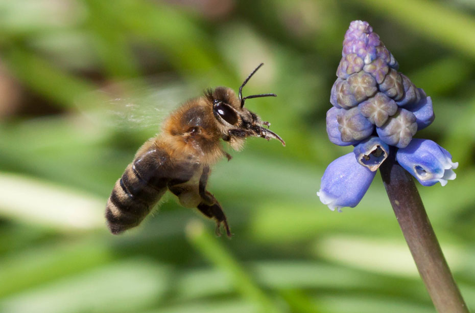 De bijen gingen nauwgezet ieder bloemetje bij langs om nectar te verzamelen. Ik koos deze keer voor een iets grotere scherpte/diepte en een korte sluitertijd. Ik wilde namelijk de bijen al vliegend vastleggen en dat lukt beter met de bovengenoemde instellingen. In de serie na onderstaande foto laat ik de bijen in vlucht zien.