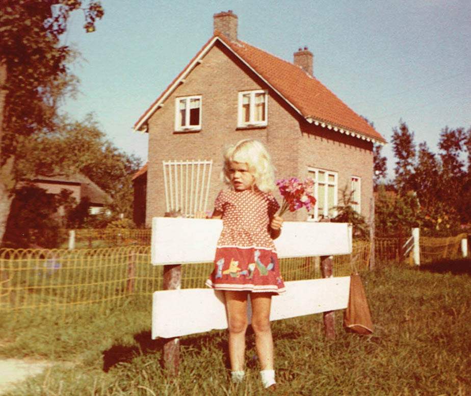 Het leven ging door, de zon kwam op en de zon ging weer onder. We gingen ‘gewoon’ door met eten en drinken, met slapen, met opstaan, met spelen en met naar school gaan. Op onderstaande foto sta ik als 6-jarig meisje te wachten op de juffrouw, die mij iedere dag achterop de fiets meenam naar de kleuterschool.