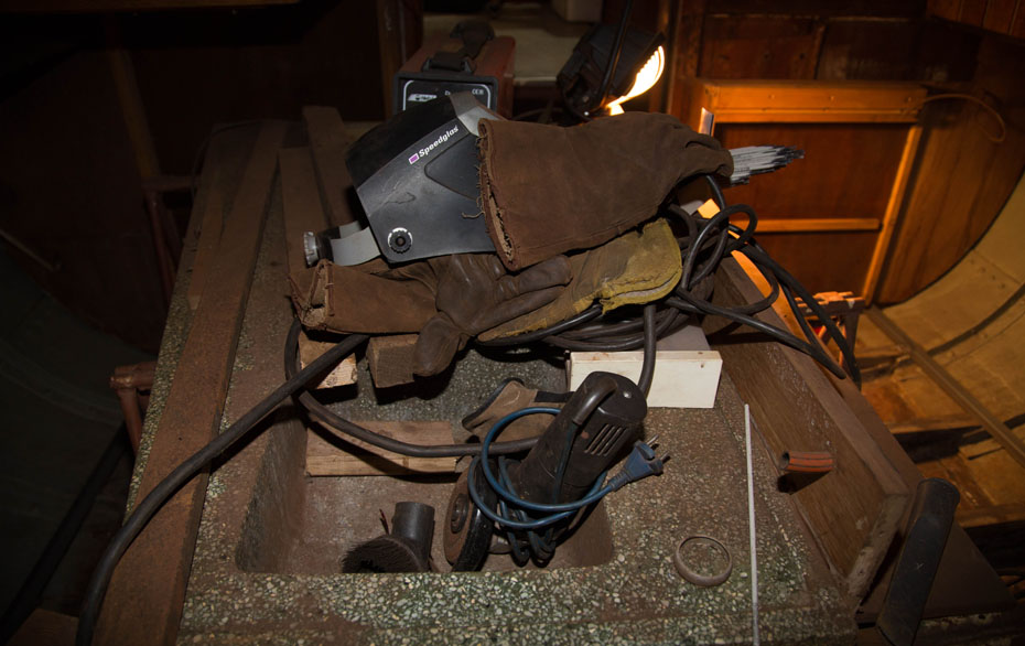 Het loodzware granieten aanrechtblad staat nu tijdelijk in het midden van het ruim. Het fungeert nu als werkblad voor het gereedschap en andere hulpmiddelen.