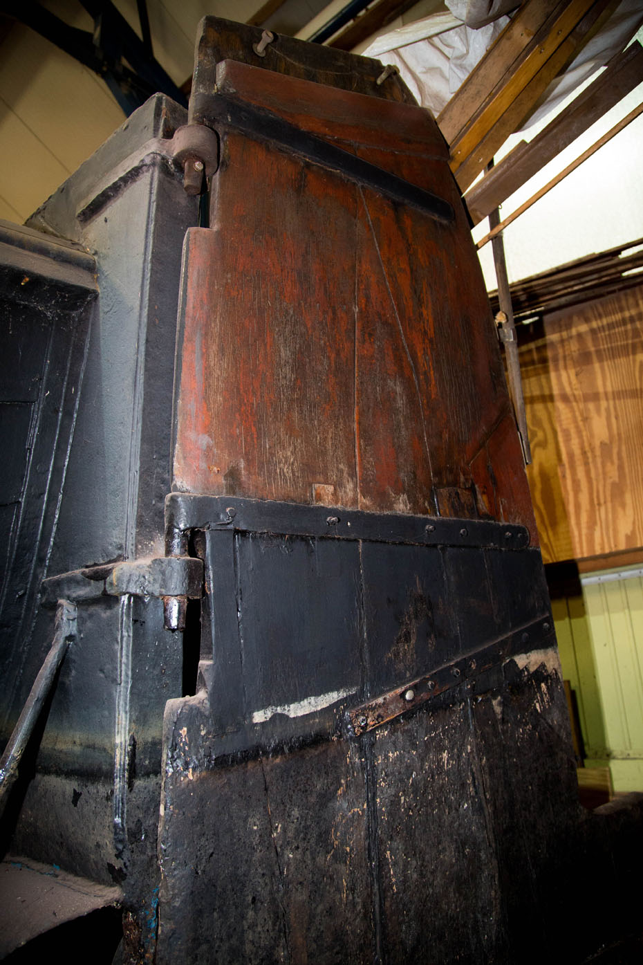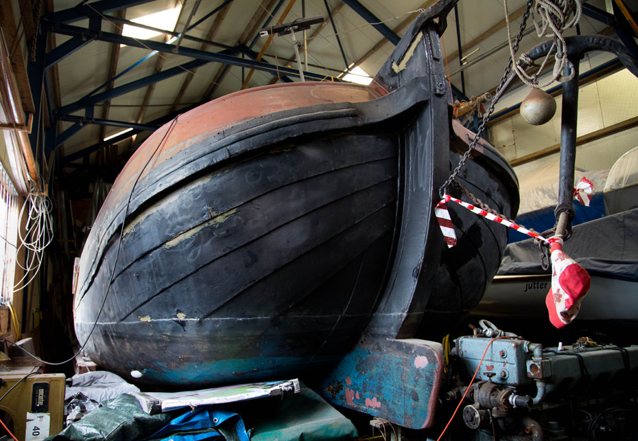 De fraai gedecoreerde helmstok ligt nu op schragen onder het schip. Iedere vierkante centimeter wordt door Han grondig gecontroleerd en waar nodig gerestaureerd.