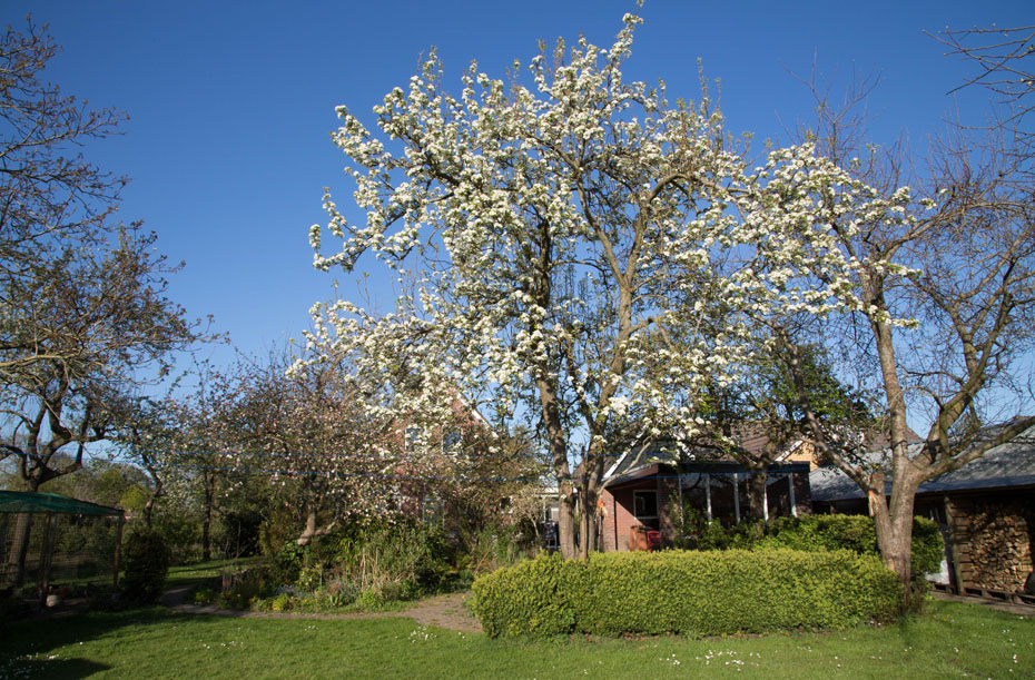 In onze tuin staan 16 hoogstam fruitbomen. Op dit moment staan de perenbomen en kersenbomen volop in bloei. De appelbomen komen er iets achteraan.
