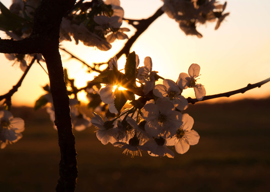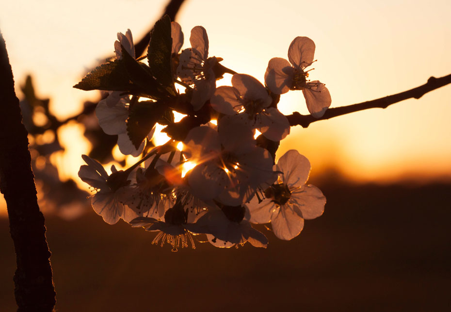 Tijdens zonsondergang legde ik de bloesem van de kersenboom vast.