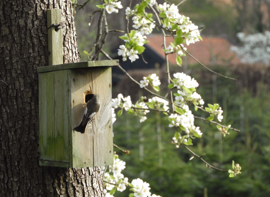 In onze tuin heb ik afgelopen week de bonte vliegenvanger gespot. Als ik op deze site kijk dan denk ik dat het een vrouwtje was. Ze verkende het nestkastje. Dit nestkastje hangt aan de perenboom in onze voortuin. De perenbomen staan op dit moment volop in bloei. De bloesem trekt weer vele insecten en daar profiteren de vogels weer van.