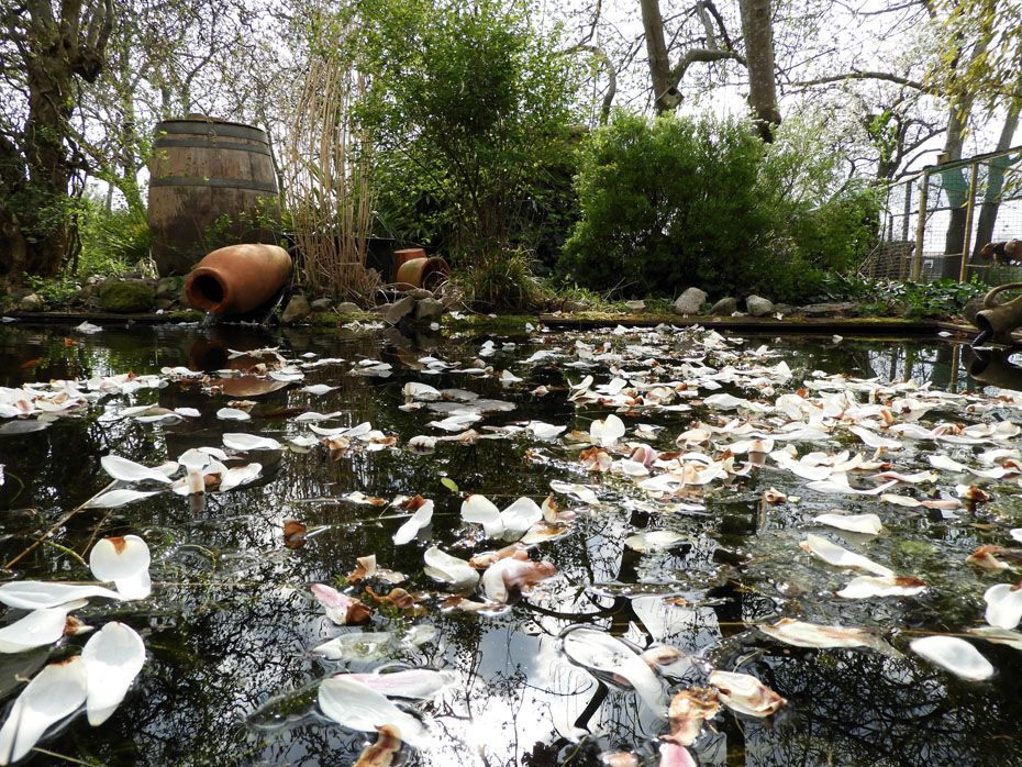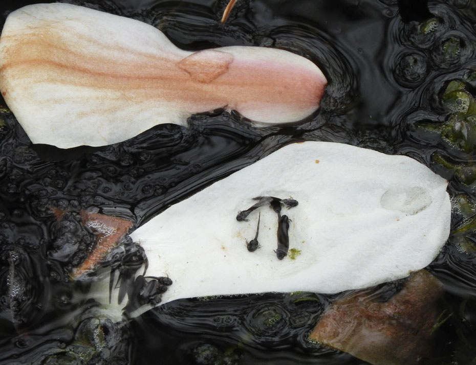 Er was een groepje kikkerlarfjes die een bloemblaadje van de magnolia gebruikten als vijvertje. De kikkerlarfjes zwommen een meter vanuit de kant van de vijver.