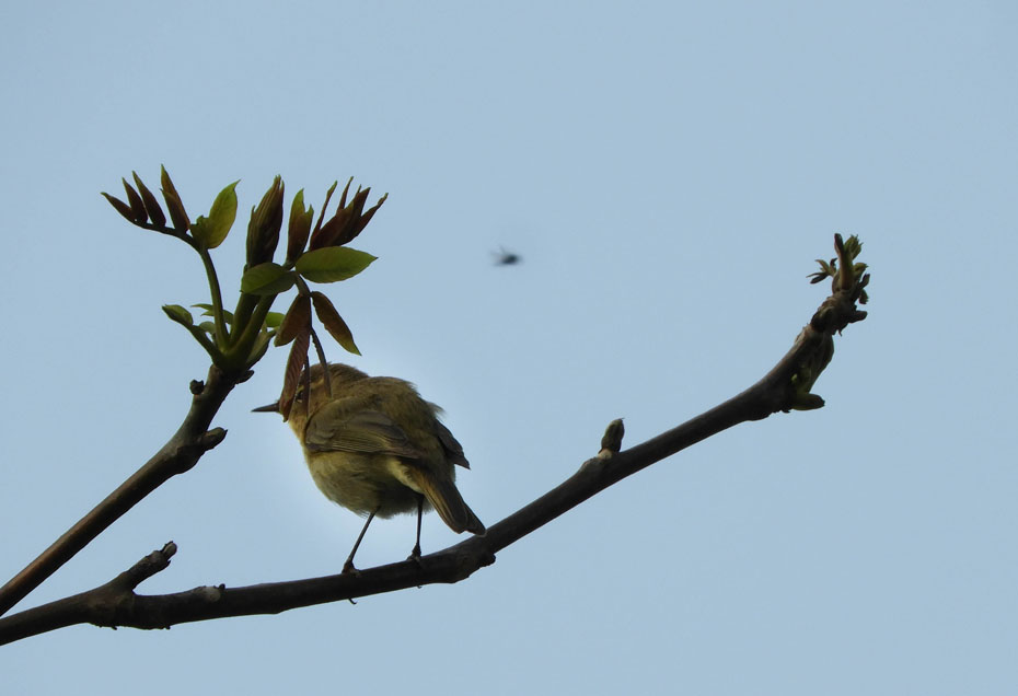 De tjiftjaf heeft onze enorme walnotenboom uitgekozen als zangpost. Het vogeltje roept ongeveer 4 keer zijn naam snel achter elkaar en vliegt vervolgens naar de volgende tak. Het vraagt dus veel geduld en inzet om er een fotoserie van te maken.