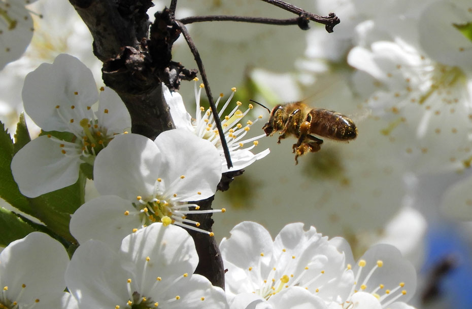 Rond de bloesem van de fruitbomen zitten vele insecten. De insecten zijn blij met zoveel bloesem in de tuin en wij zijn op onze beurt weer blij met deze bestuivers. De vogels zijn vervolgens weer blij met de insecten, je ziet ze dan ook nauwgezet de bloesem bij langs gaan op zoek naar een smakelijk hapje. Op onderstaande foto lijkt het erop dat deze insect de dans is ontsprongen.