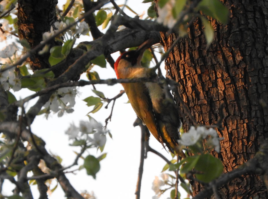 Gisteravond, tijdens zonsondergang kwam zowaar de groene specht een bezoek brengen aan onze perenboom. De groene specht heeft zijn nest in een populier op een perceel grenzend aan onze tuin. We horen de specht veelvuldig, maar vastleggen is een tweede. Ze zijn nogal snel en schichtig. Gisteravond zat de specht verscholen achter de takken. De warme kleuren van de zonsondergang werkten mooi mee. Vanuit de woonkamer heb ik er enkele foto’s van gemaakt. Doordat de specht zat verscholen achter de takken zijn ze helaas niet goed gelukt. Onderstaande foto is nog redelijk. Het gaat dus om het idee.