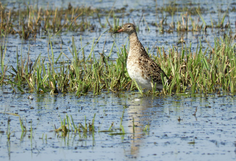 Vlak voordat ik de wulpen had vastgelegd zag ik een kemphaan eenzaam in het water staan. De kemphaan keek wel meerdere malen mijn kant op, maar bleef toch langere tijd staan.