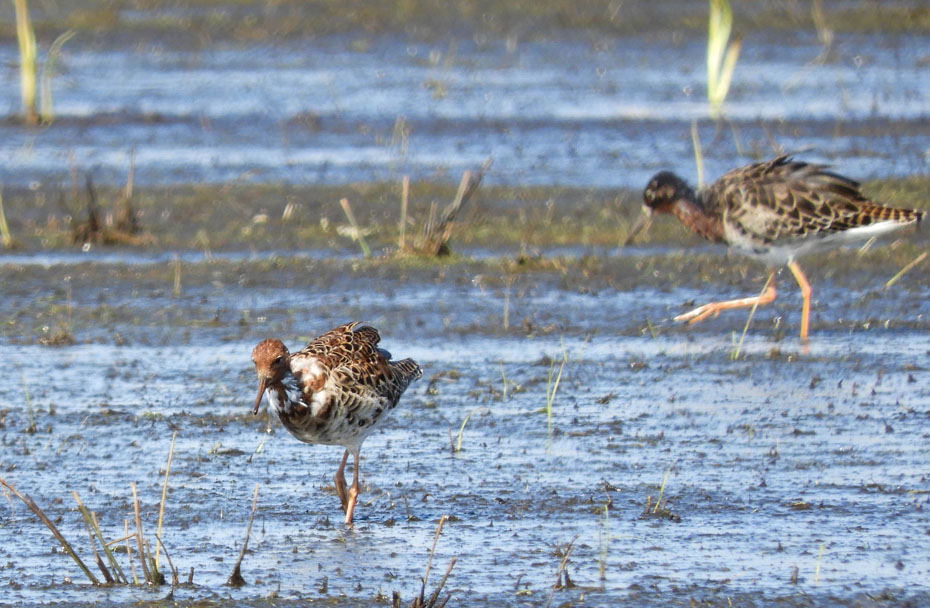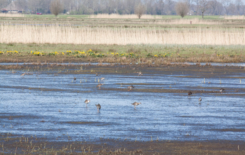 Een eindje verderop was een groep kemphanen druk aan het foerageren.