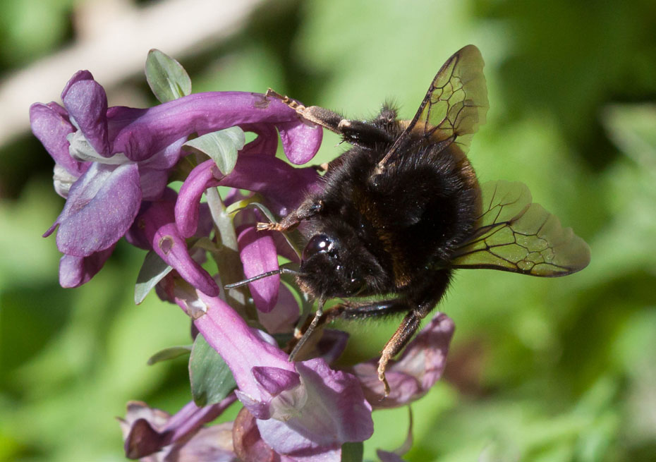 Op de dag dat ik daar aan het fotograferen was, was de temperatuur nog niet hoog. Er vlogen dan ook nauwelijks insecten rond de bloemen van de holwortel. Gelukkig vlogen er een handjevol hommels die ik vervolgens bestookte met mijn macrolens. Ik heb deze keer een wat grotere scherpte/diepte gehanteerd in de hoop ze vliegend vast te kunnen leggen. Dat viel nog niet mee, omdat er bij zoveel bloemetje altijd maar weer afwachten is welke kant ze opvliegen. En zo gebeurde het dat de hommel al bijna het beeld was uitvlogen voordat ik hem had vastgelegd.