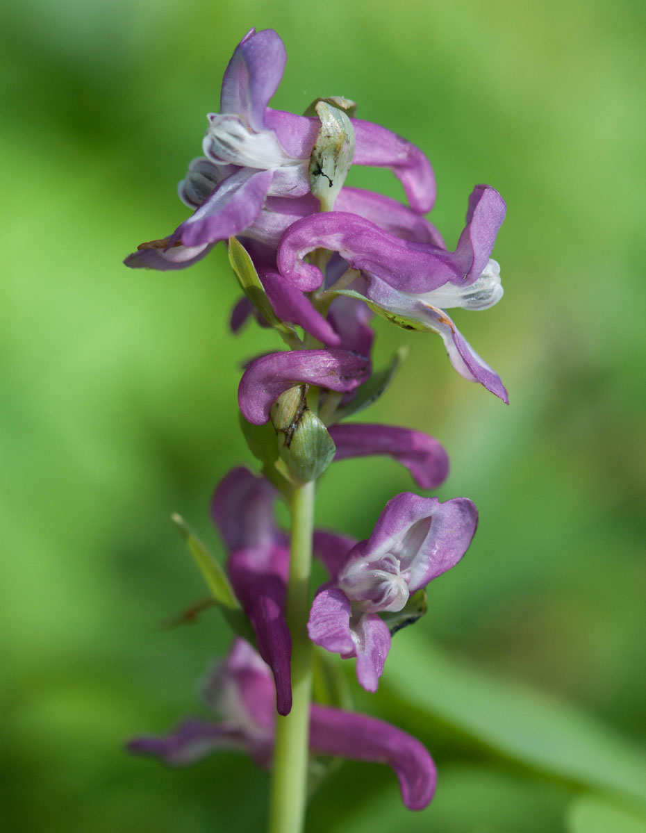 De spoor van de bloem steekt ongeveer tot 12 millimeter over de bloemsteel uit. In het achterste deel van de spoor zit de honig. Omdat de spoor zo lang is kunnen alleen de insecten erbij met een lange tong of snuit (sachembij, wolzwevers of vlinders) tot achterin het spoor komen. De aardhommel bijvoorbeeld (Bombus terrestris) is te groot voor de nauwe bloem en bijt ter hoogte van de knik, gewoon een gaatje om bij de nectar achterin de spoor te komen. En zo kunnen meerdere bijen (de honingbij o.a.) bij de honing. De bijen die niet in de ´buis´ passen, proberen het eerst wel. Doordat ze landen op de onderste lip buigt deze een beetje door. De meeldraden en de stamper komen vrij en laten stuifmeel op het insect los. Het insect vliegt naar een andere holwortel voor nectar en zorgt zo voor kruisbestuiving. Althans zo hoort het te gaan aldus deze site.