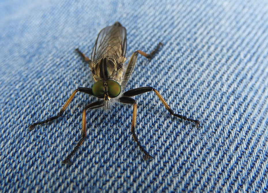 Tijdens het fotograferen van de schapen en de geiten landde er een insect op mijn broek. Voor het determineren gebruikte ik deze site. Ik denk dat het een bruinvleugelroofvlieg is.