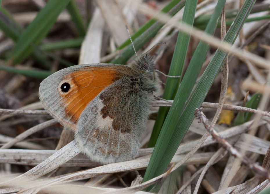 Onderweg maakte ik meerdere stops. Tijdens een van die stops zag ik een heel klein vlindertje fladderen. Het bleek te gaan om een hooibeestje. Dit vlindertje koos steeds een plekje tussen de begroeiing op de grond. Het is voor mij de eerste keer dat ik een hooibeestje heb gefotografeerd.