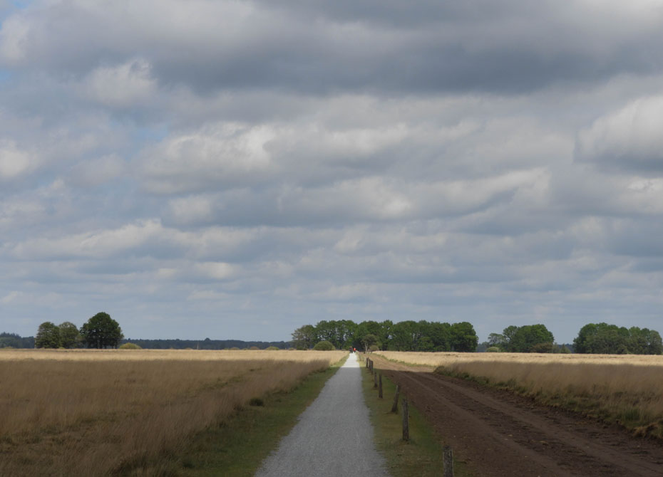 Nadat ik het hooibeestje en het groentje had vastgelegd fietste ik verder over het fietspad dwars over de heide. Het was rustig. Zo nu en dan maakte ik een stop om te genieten van het lichtspel van de zon met de wolken.