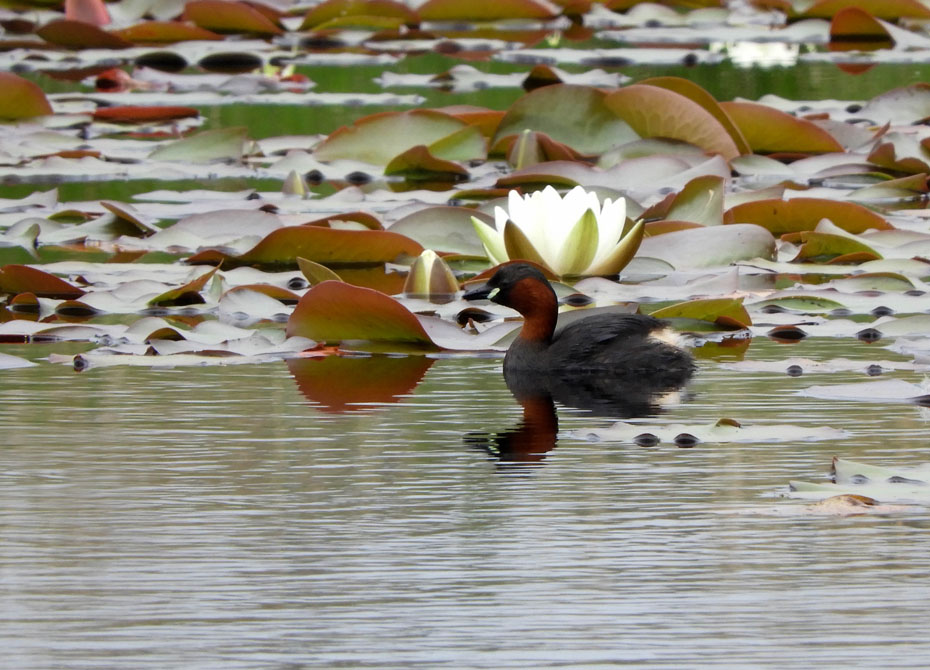 De dodaars is onze kleinste futensoort. Deze schuwe watervogel is zelfs nog een slag kleiner dan de meer bekende waterhoen. De dodaars is een broedvogel van ondiepe en beschutte wateren met een rijke oeverbegroeiing en onderwatervegetatie, zoals moerasgebieden, vennen en meren. Bron: deze site. Op onderstaande overzichtsfoto is te zien dat de dodaars een slim plekje had gevonden tussen de waterlelies, hij is zo bijna niet te zien.