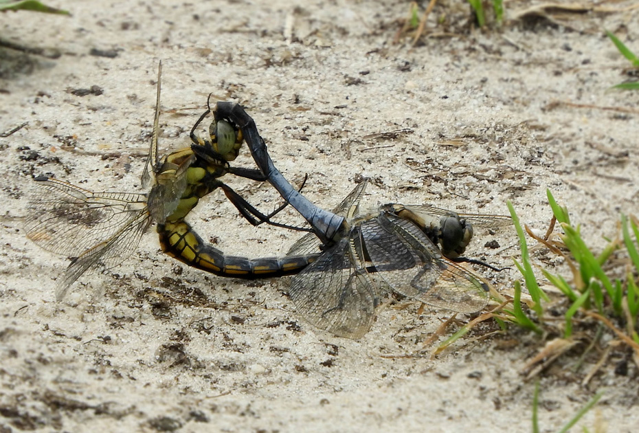 Er vloog een paringsrad van libellen voorbij. Ze landden op het pad een eindje bij ons vandaan. Door in te zoomen met de bridgecamera kon ik ze vastleggen. Geen mooie ondergrond dan wel achtergrond, maar toch krijgt deze foto hier een plekje. Het lukt mij zelden om een paringsrad van libellen vast te leggen. Volgens mij gaat het hier om de gewone oeverlibel.