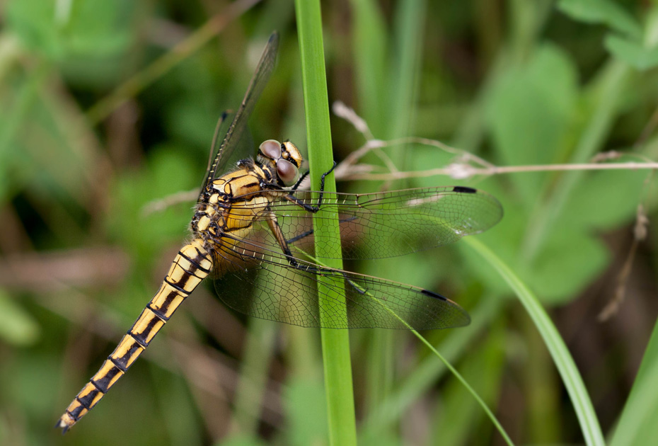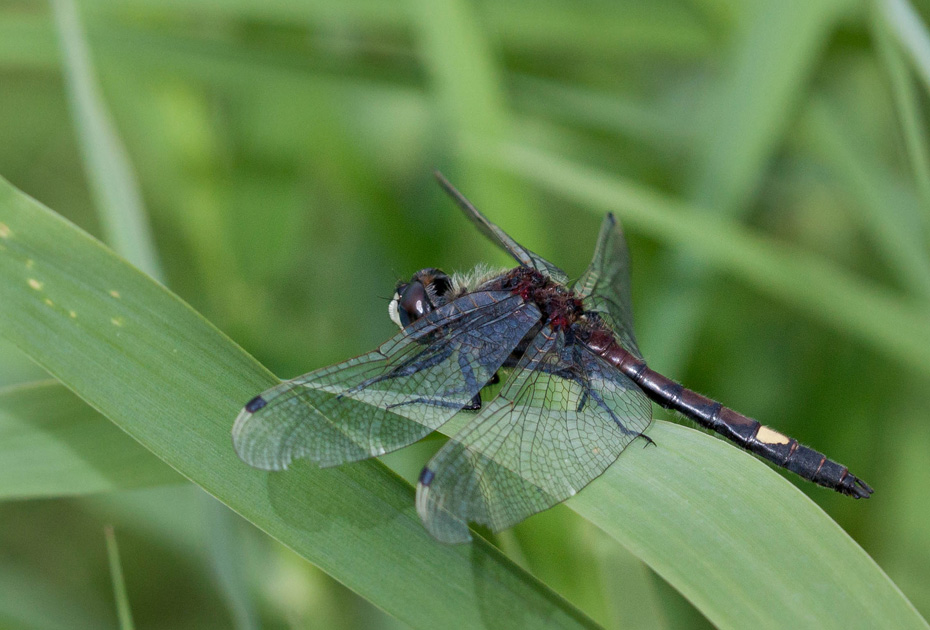 We gingen specifiek op zoek naar libellen en wel naar witsnuitlibellen. Eigenlijk waren we aan de late kant, want het seizoen voor bijvoorbeeld de gevlekte witsnuitlibel loopt ten einde. Dat is dan ook wel te zien aan de slijtage aan de vleugels. Ze waren onrustig en lastig te fotograferen, ik heb er slechts eentje acceptabel op de foto kunnen krijgen.