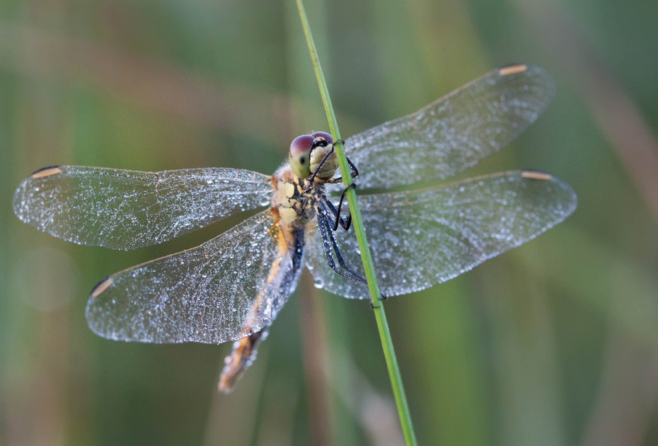 Op een dag ging ik vroeg in de ochtend naar de Weerribben. De libellensoorten die ik eerder overdag had vastgelegd wilde ik graag nog een keer fotograferen maar dan met dauwdruppels. Die missie is geslaagd. Vandaag is er aandacht voor de Kempense heidelibel.