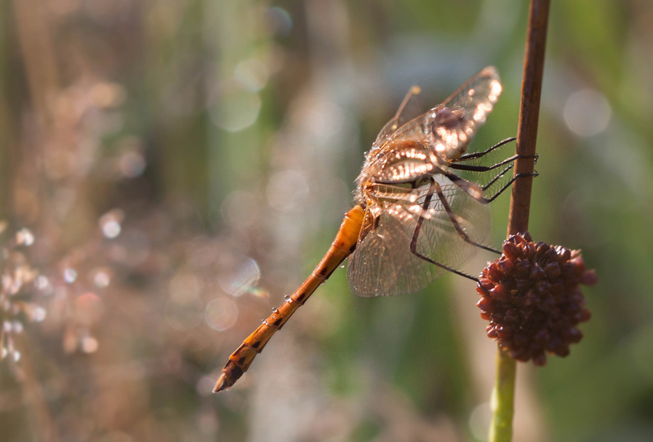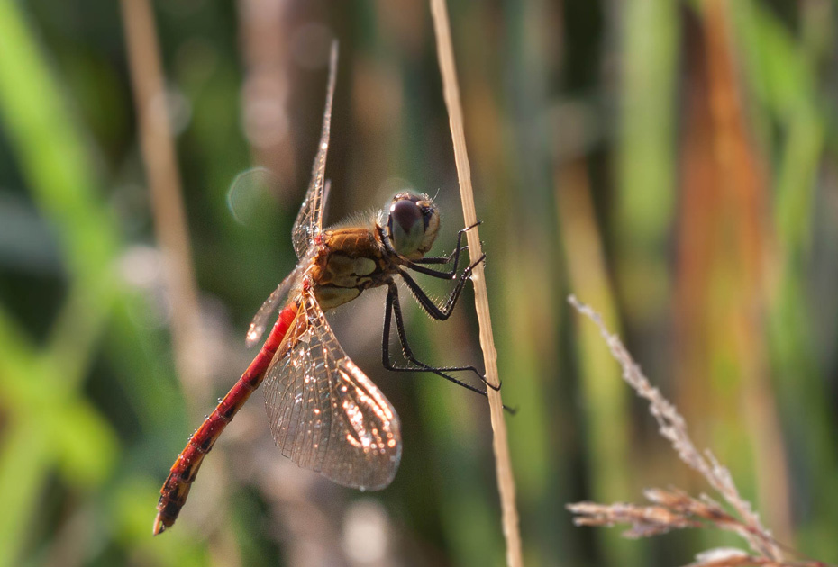Toen het zonnetje op de libel ging schijnen kregen de vleugels een prachtige kleur.