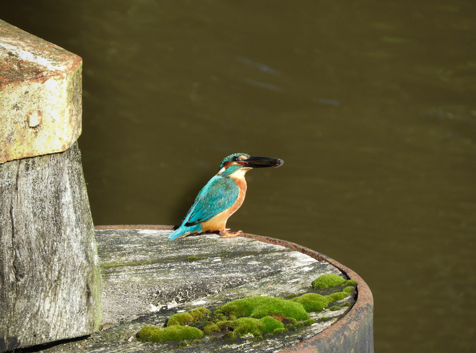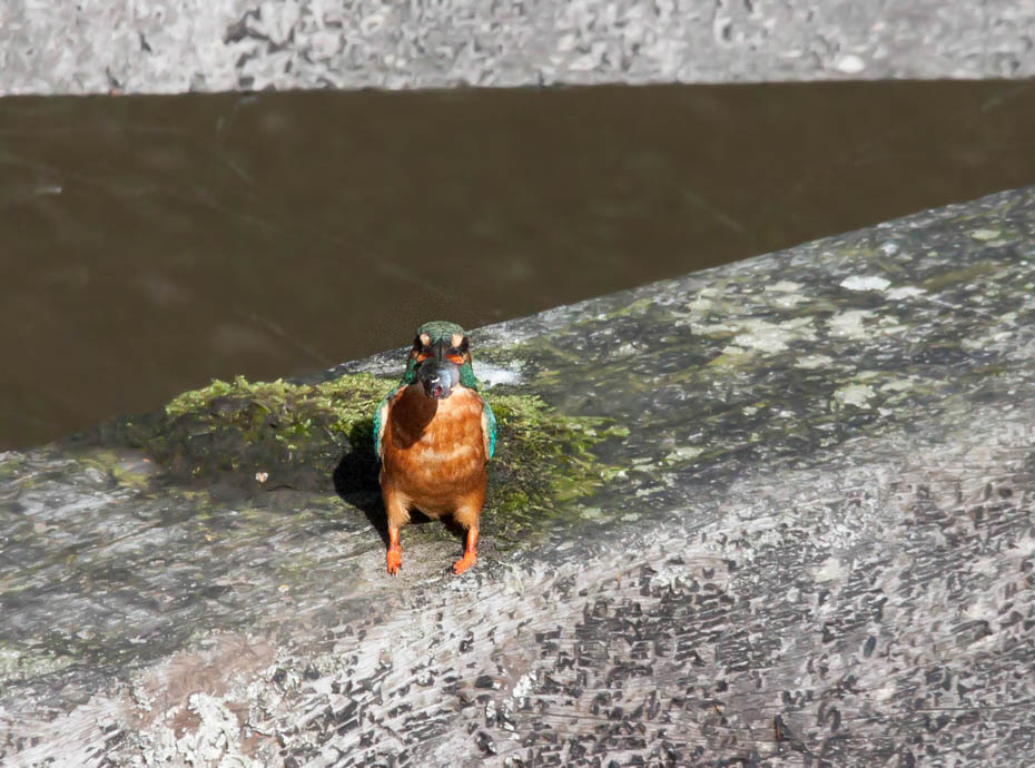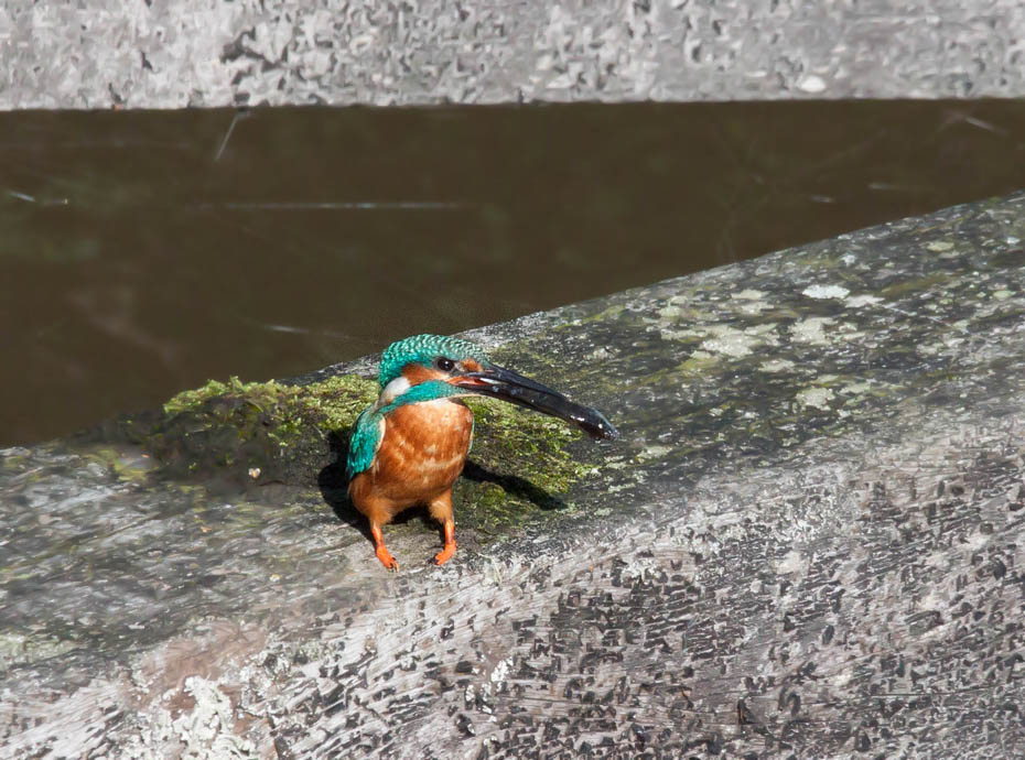 Nadat ik de ijsvogel een aantal keren in vlucht had vastgelegd kreeg ik een buitenkans. Een ijsvogel streek in de buurt neer op het remmingswerk naast het bruggetje. De onderste drie foto’s maakte ik met de Canon spiegelreflex met 70-200 mm zoom. De foto’s zijn wel gekropt.